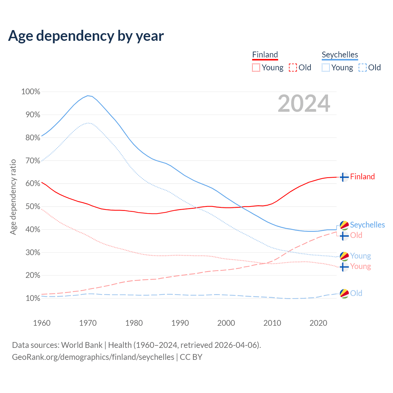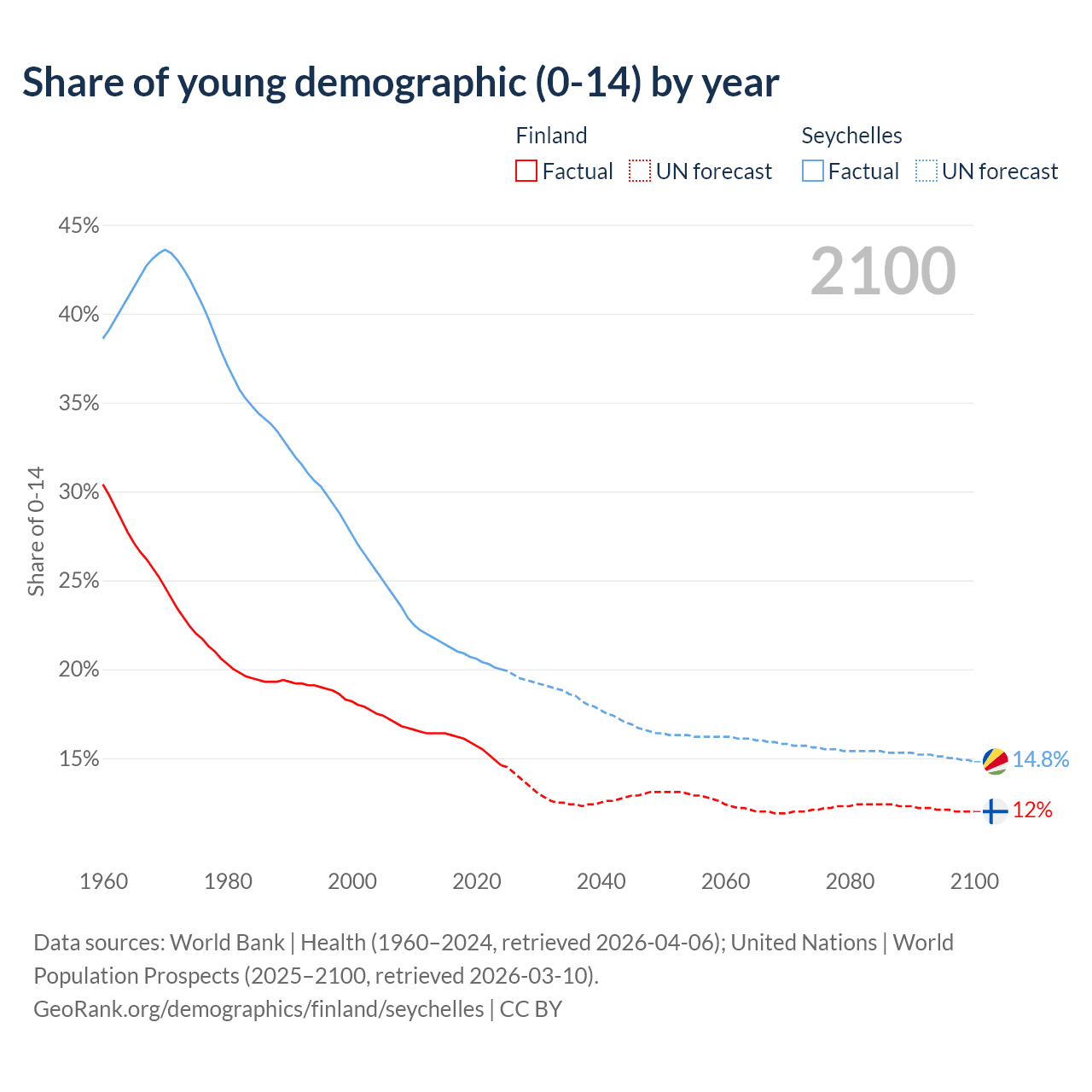 - The share of young demographic (0-15 years old) in Finland is 14.6% vs 20% in the Seychelles.