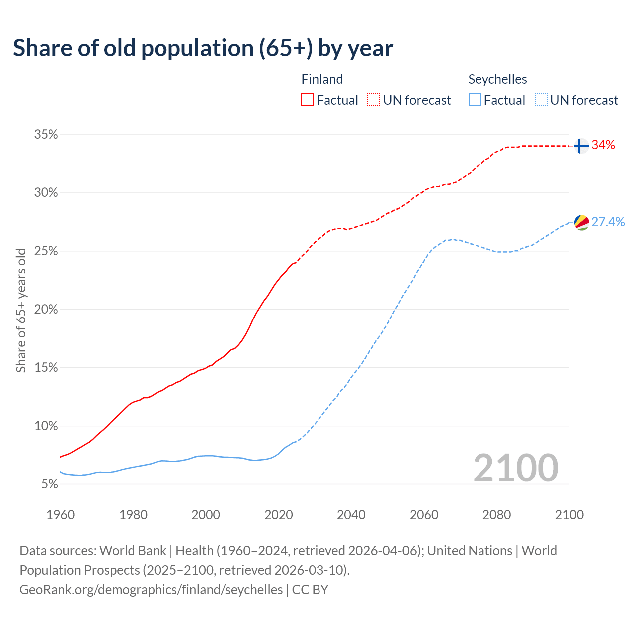 The share of older people aged 65 and over is 23.9% in Finland and 8.54% in the Seychelles. Life expectancy in Finland compared to the Seychelles .