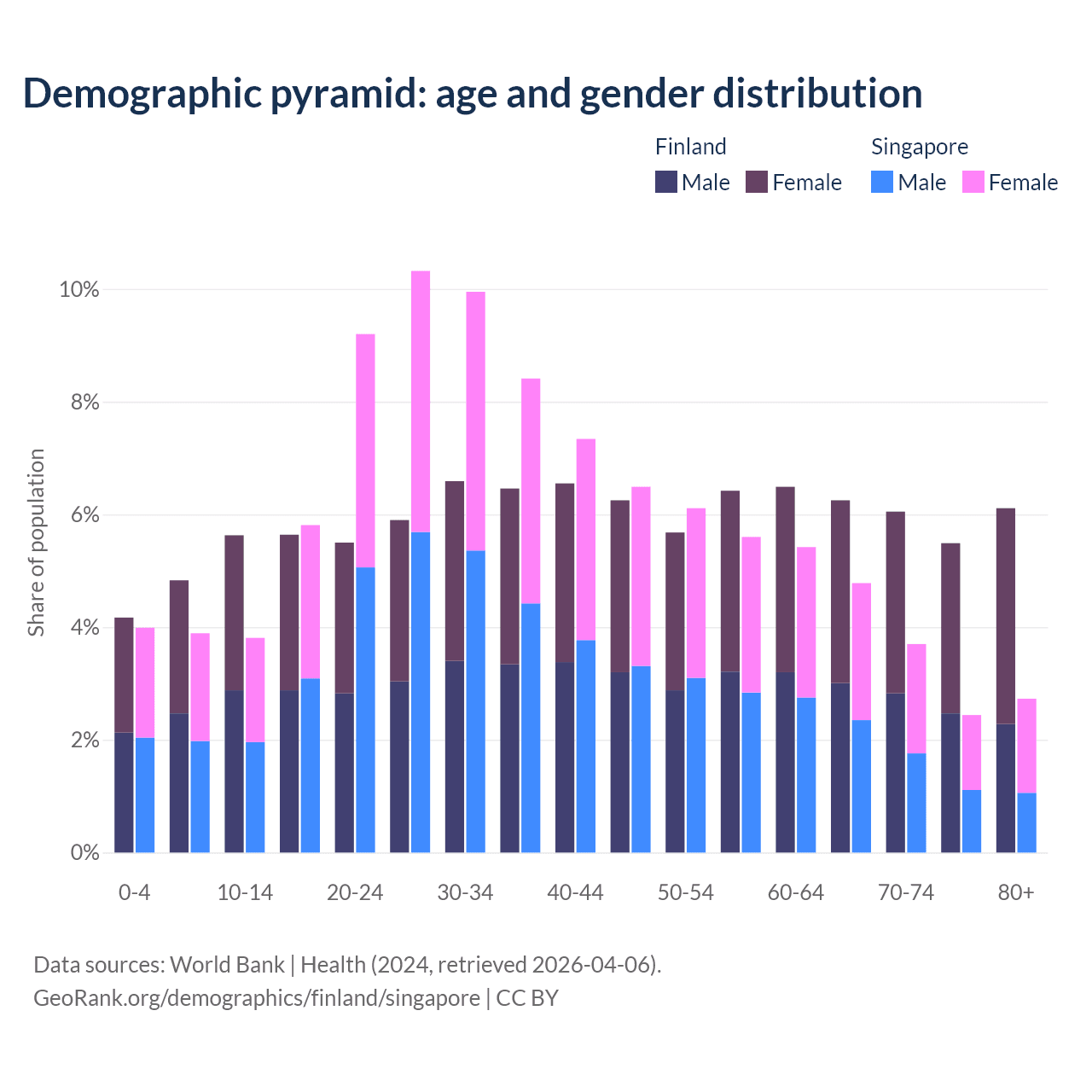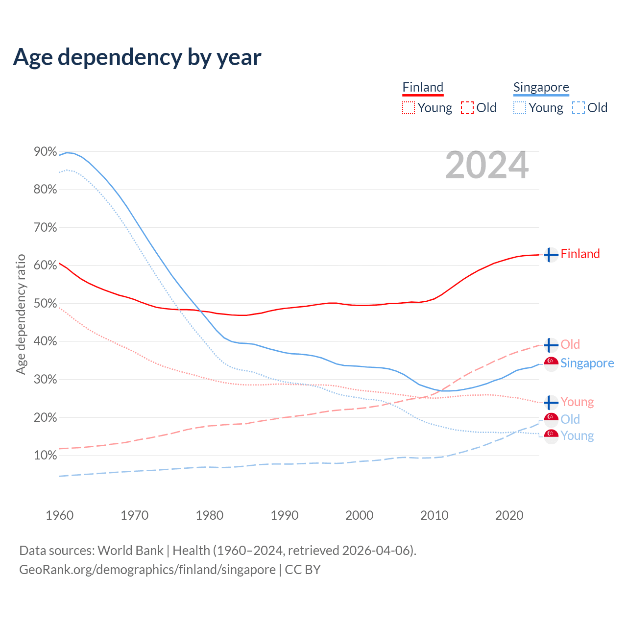 - Finland is ranked 22/196 by median age (oldest to youngest) vs 68/196 for Singapore.