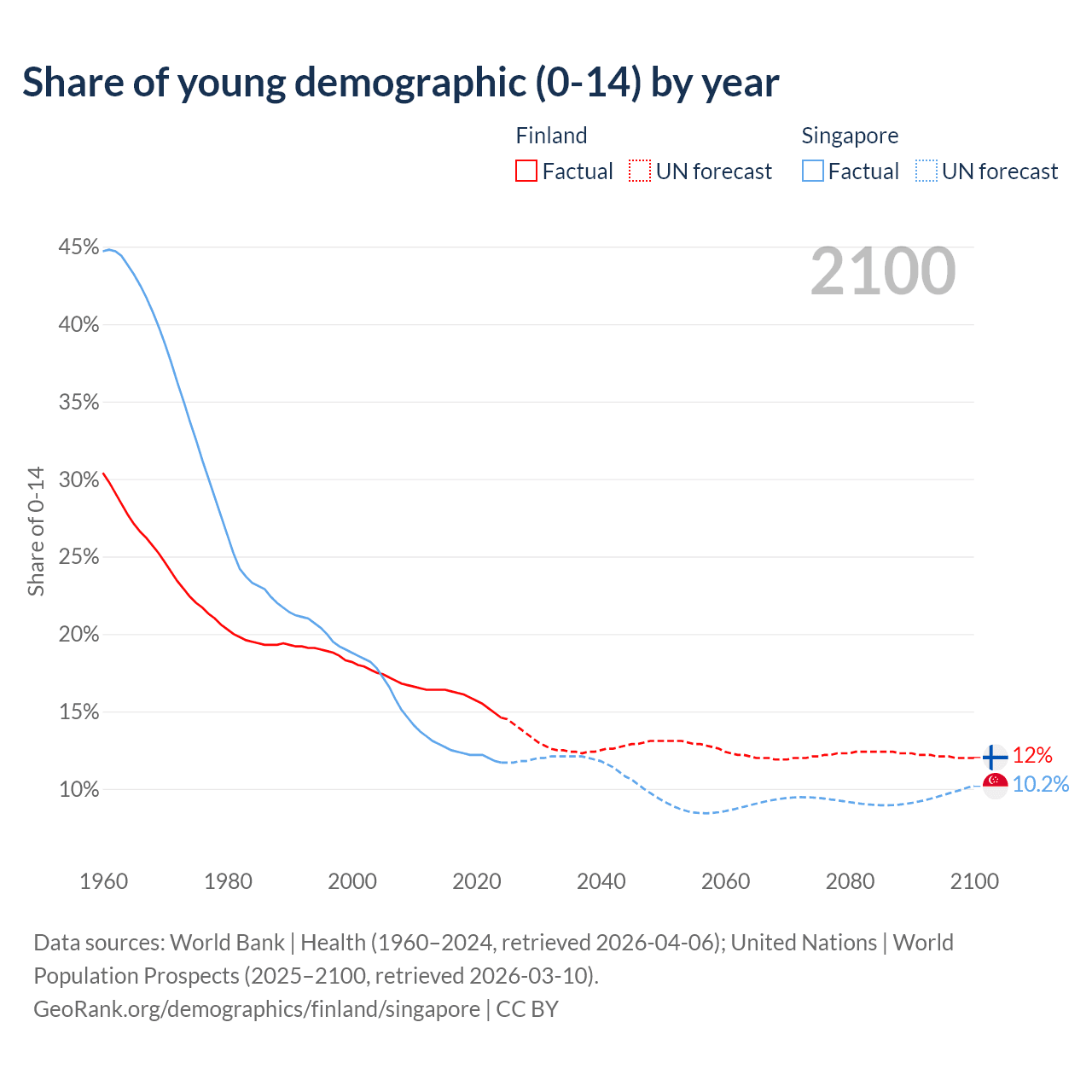 - The share of young demographic (0-15 years old) in Finland is 14.6% vs 11.7% in Singapore.