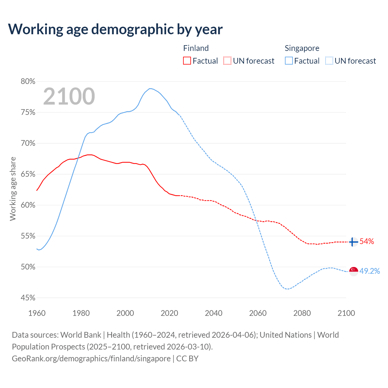 - Finland has 3.46M working age adults (aged 15-64) vs 4.57M in Singapore.