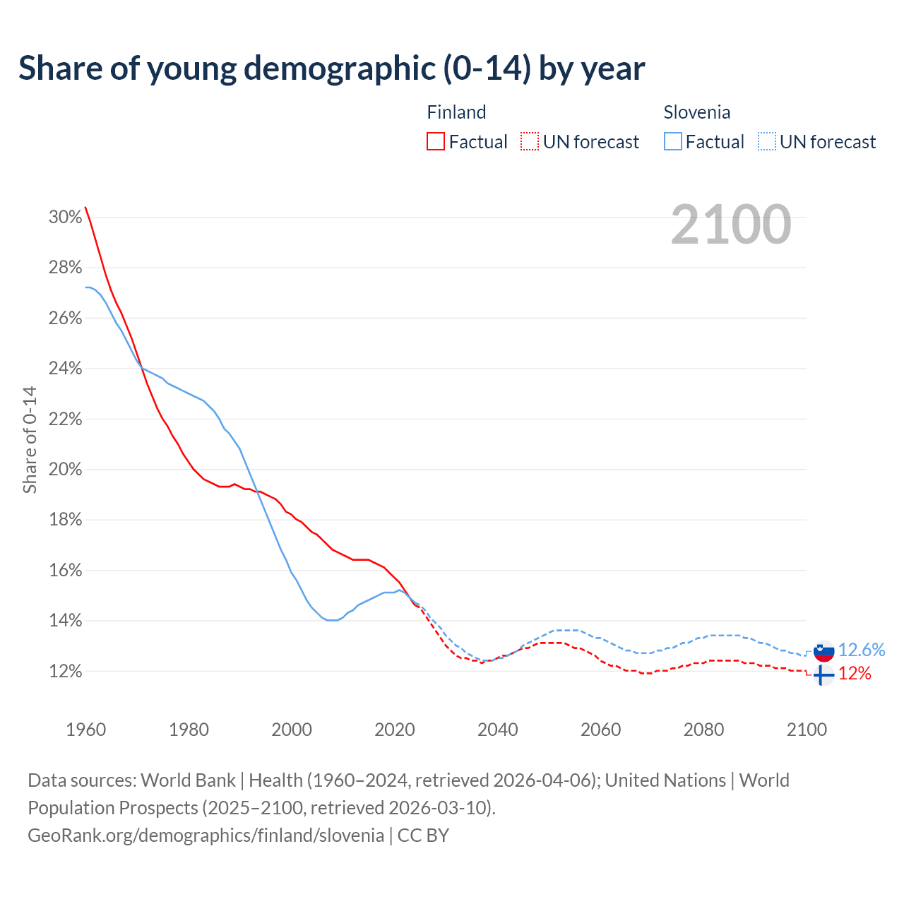 - The share of young demographic (0-15 years old) in Finland is 14.6% vs 14.7% in Slovenia.