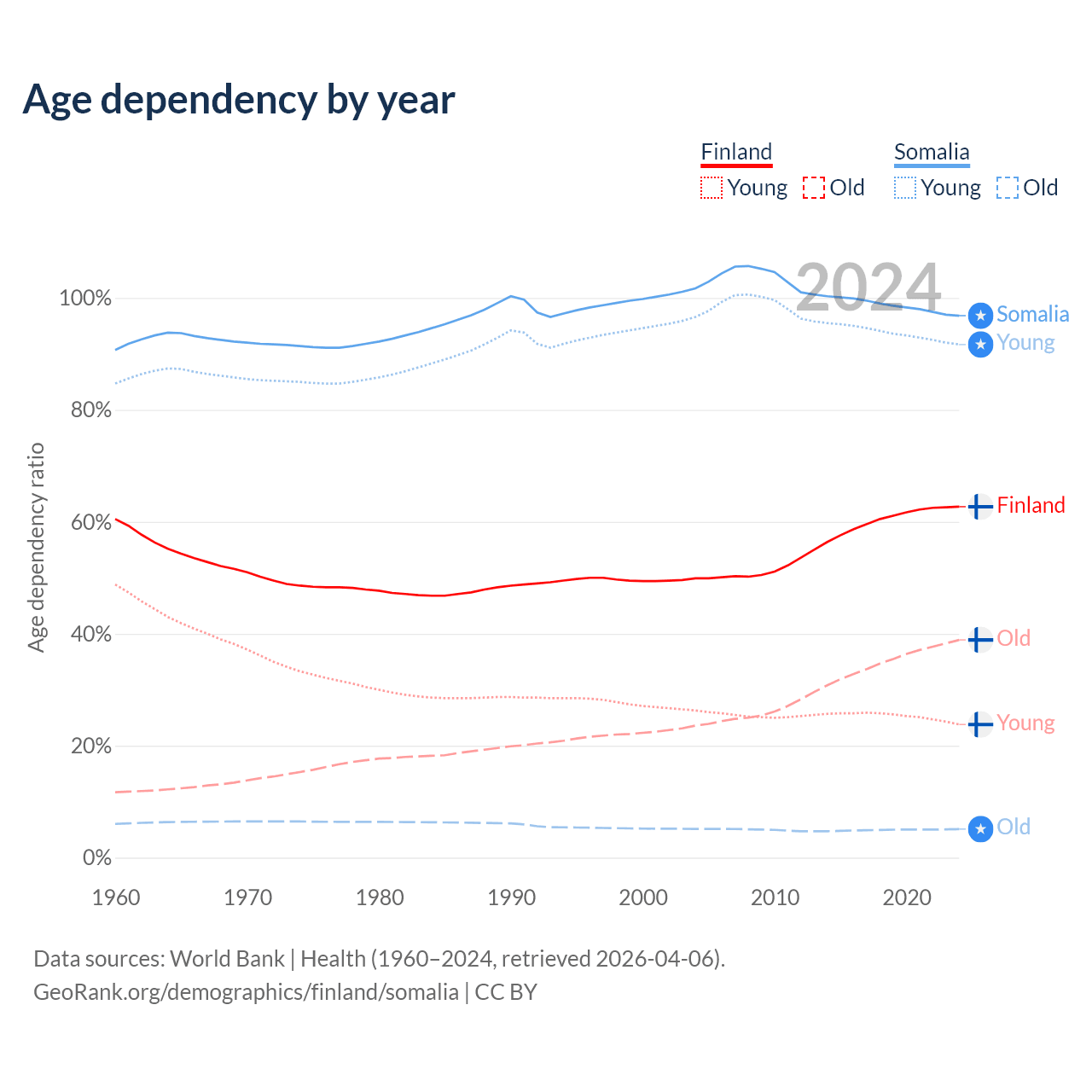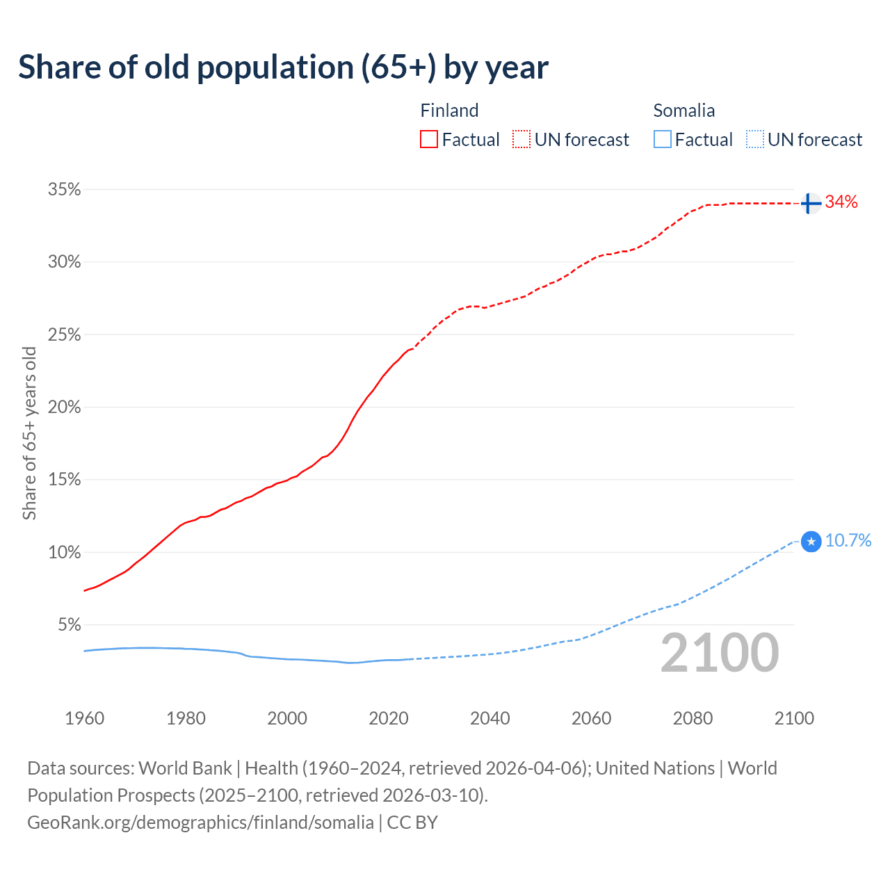- The share of old-age demographic (65+) in Finland is 23.9% vs 2.59% in Somalia.