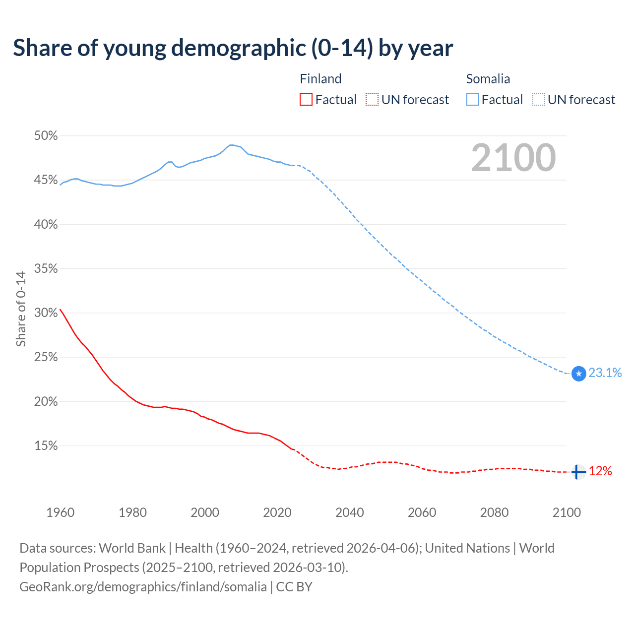 - The share of young demographic (0-15 years old) in Finland is 14.6% vs 46.6% in Somalia.