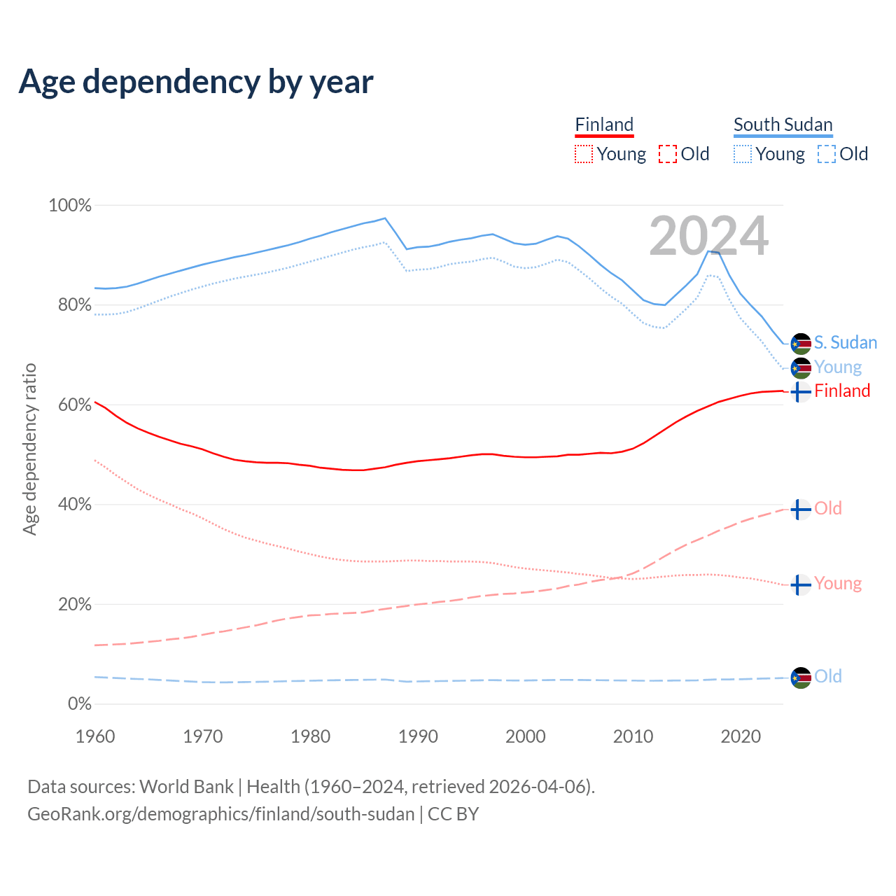 - The share of old-age demographic (65+) in Finland is 23.9% vs 2.99% in South Sudan.