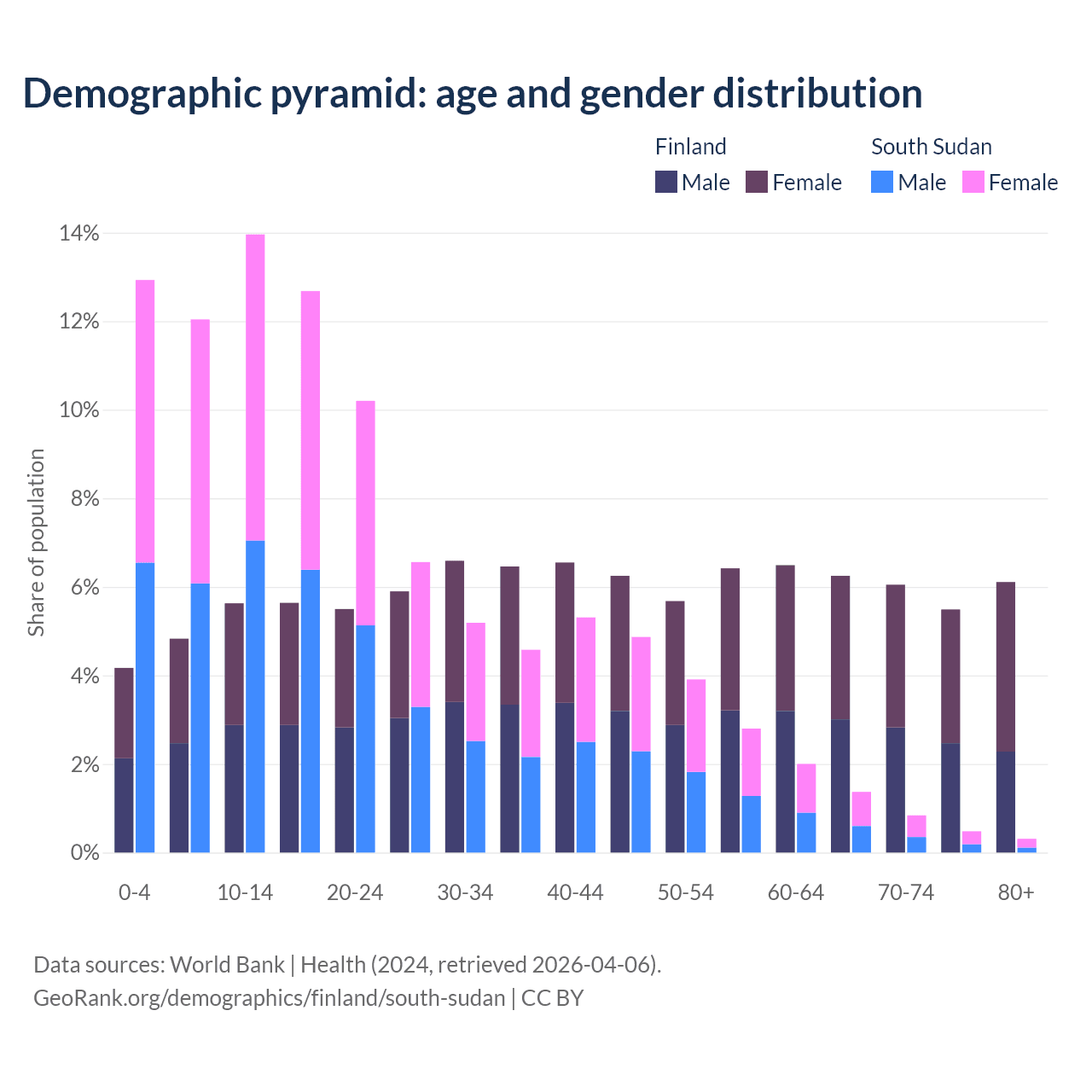 - The share of young demographic (0-15 years old) in Finland is 14.6% vs 38.9% in South Sudan.