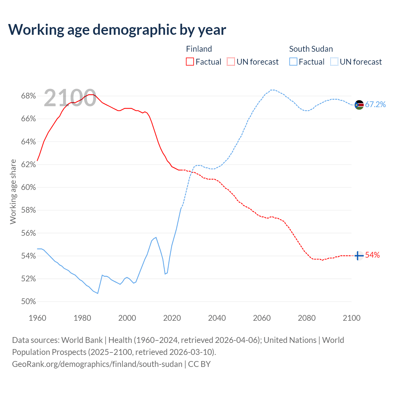 - Finland has 3.46M working age adults (aged 15-64) vs 7.27M in South Sudan.