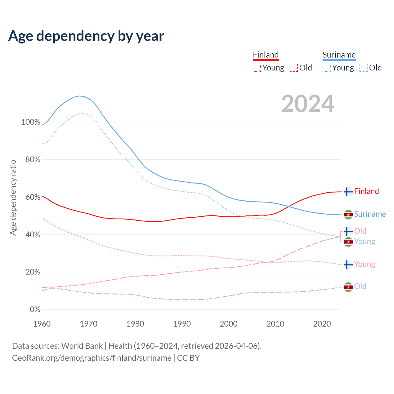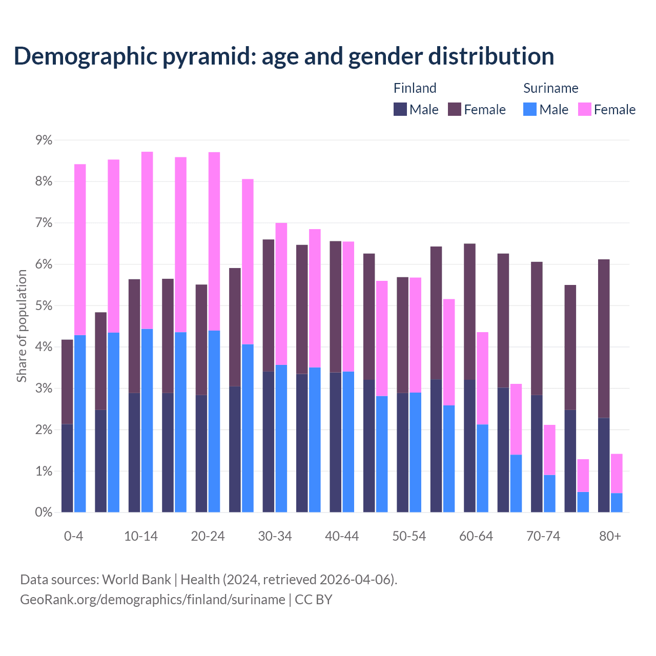 - The share of old-age demographic (65+) in Finland is 23.9% vs 7.9% in Suriname.