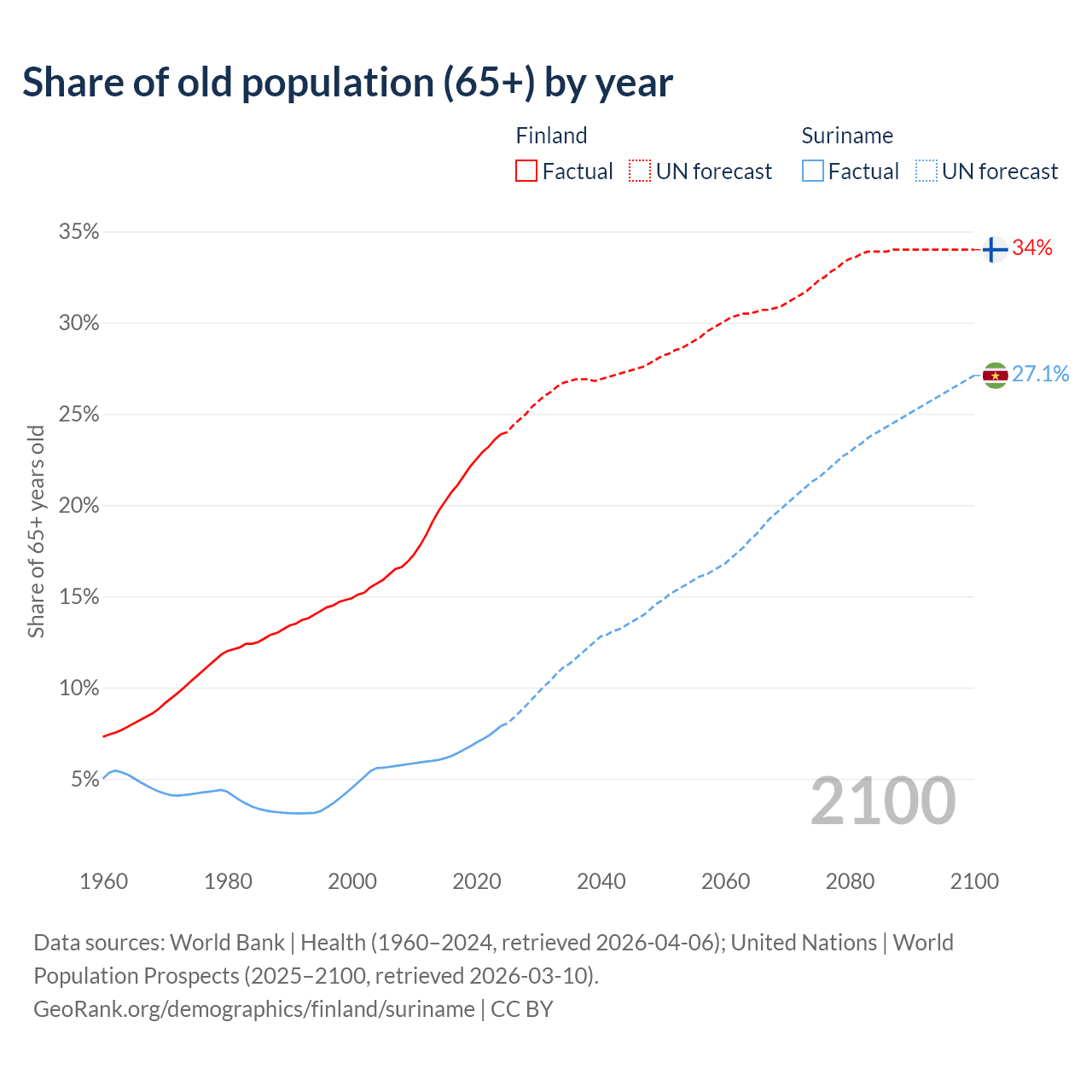 The share of older people aged 65 and over is 23.9% in Finland and 7.9% in Suriname. Life expectancy in Finland compared to Suriname .