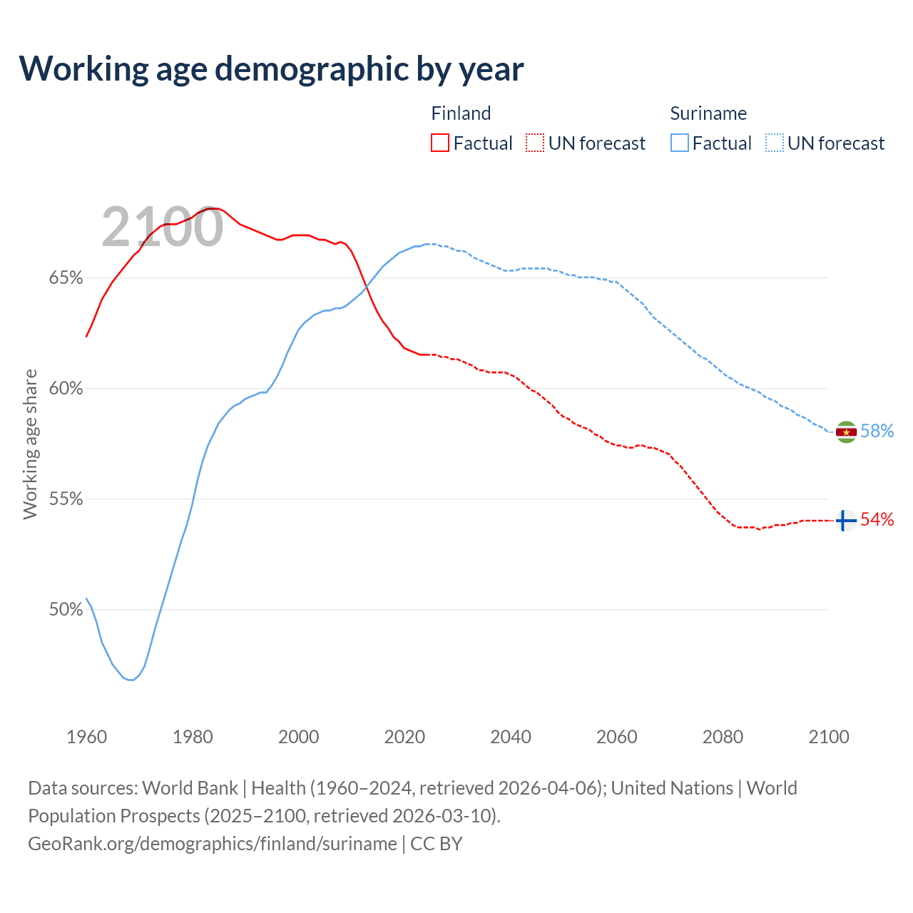Median age Finland vs Suriname, 1960-2100