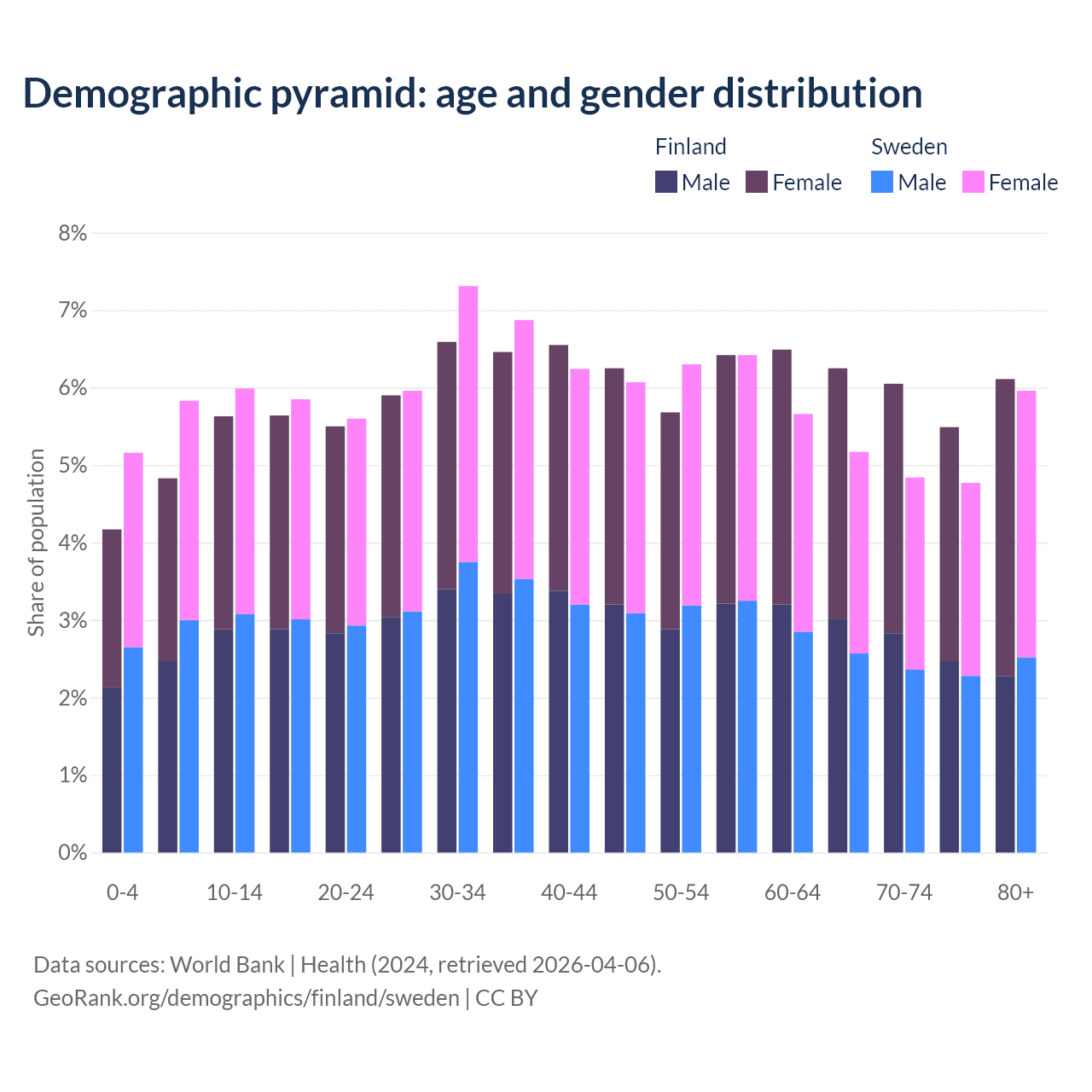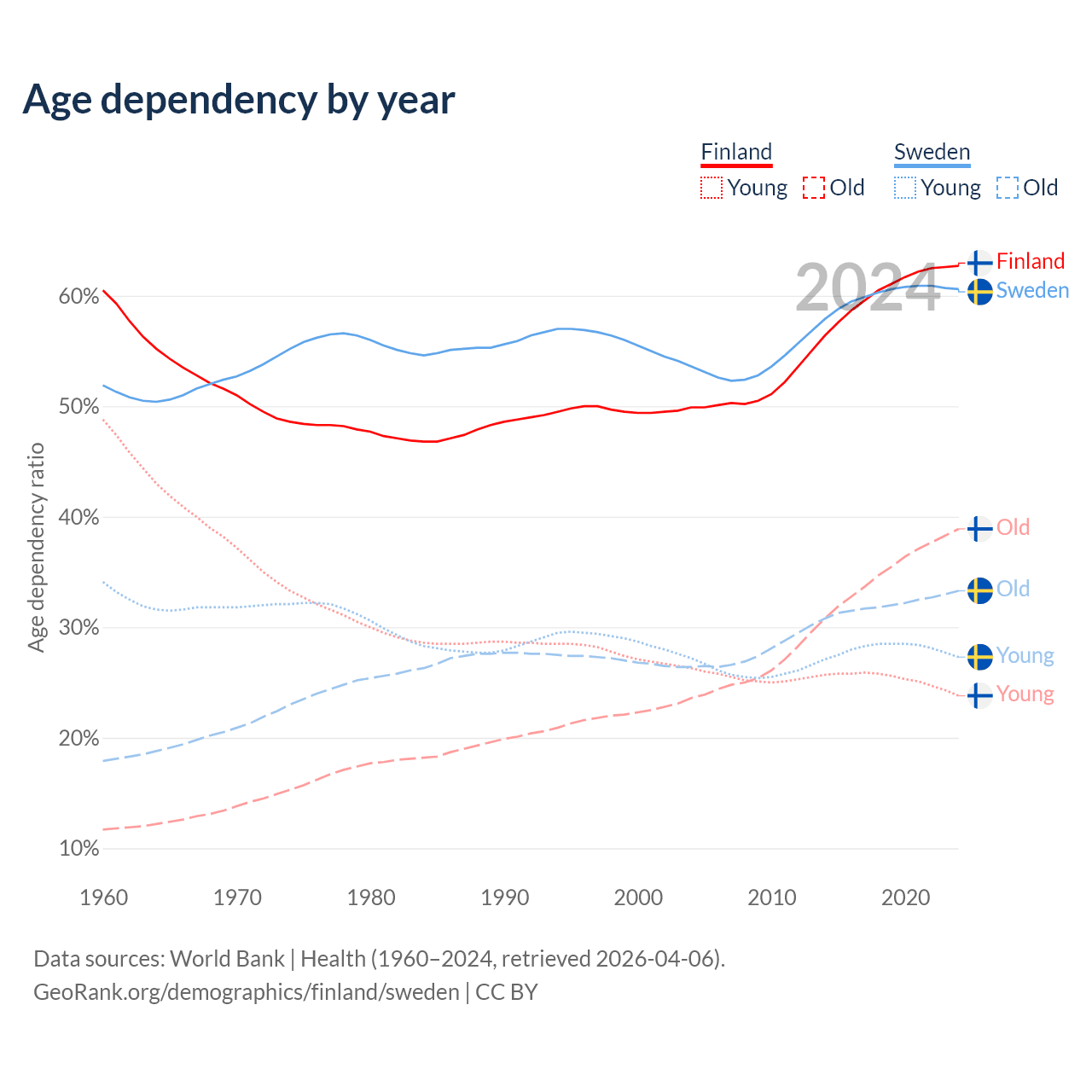 - Finland is ranked 22/196 by median age (oldest to youngest) vs 39/196 for Sweden.