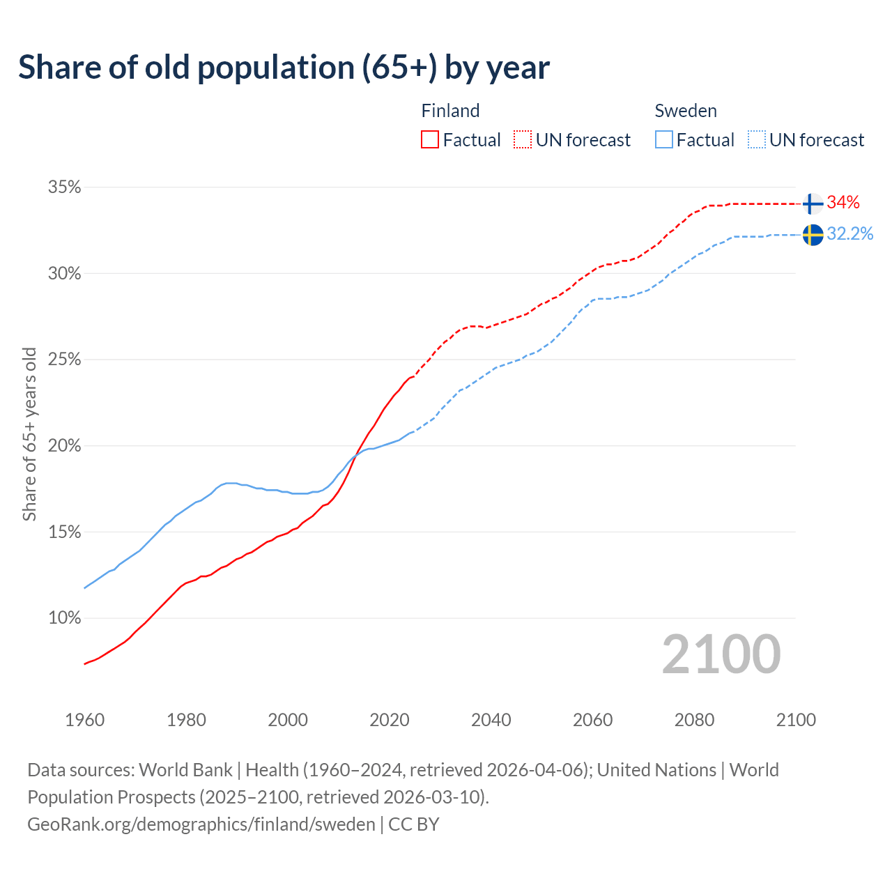 The share of older people aged 65 and over is 23.9% in Finland and 20.7% in Sweden. Life expectancy in Finland compared to Sweden .