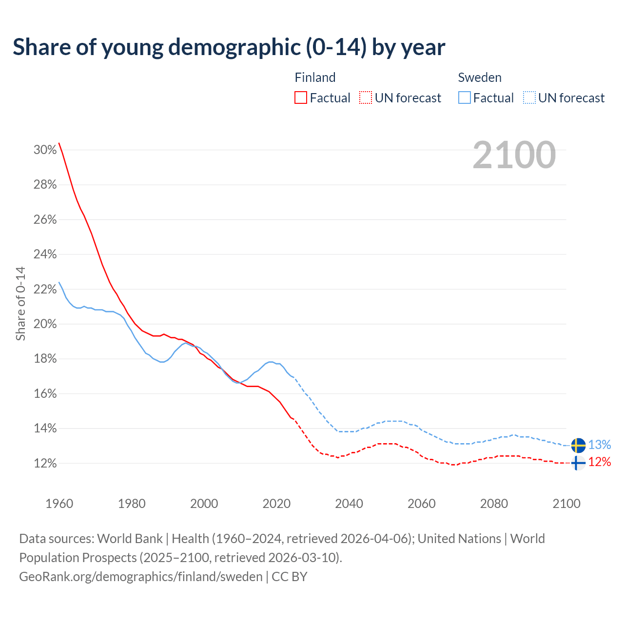 - The share of young demographic (0-15 years old) in Finland is 14.6% vs 17% in Sweden.