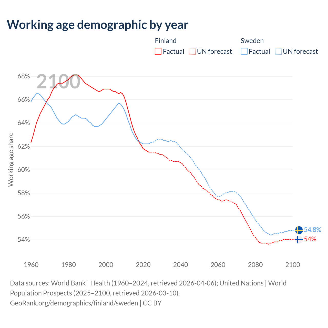 Median age Finland vs Sweden, 1960-2100
