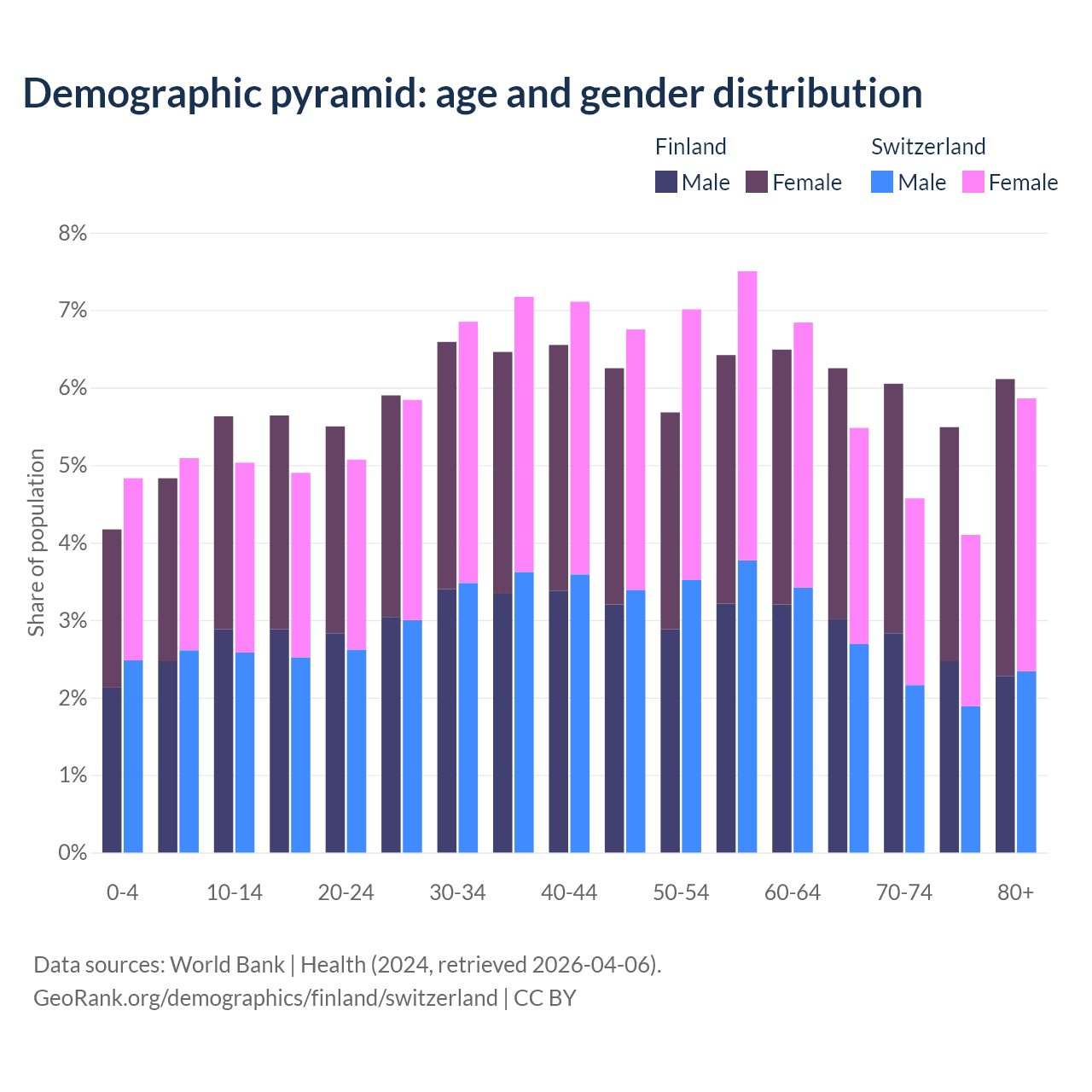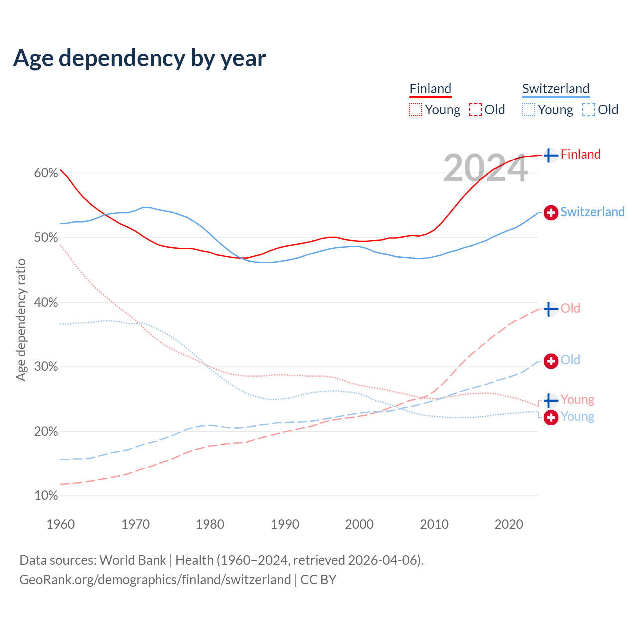 - Finland is ranked 22/196 by median age (oldest to youngest) vs 24/196 for Switzerland.