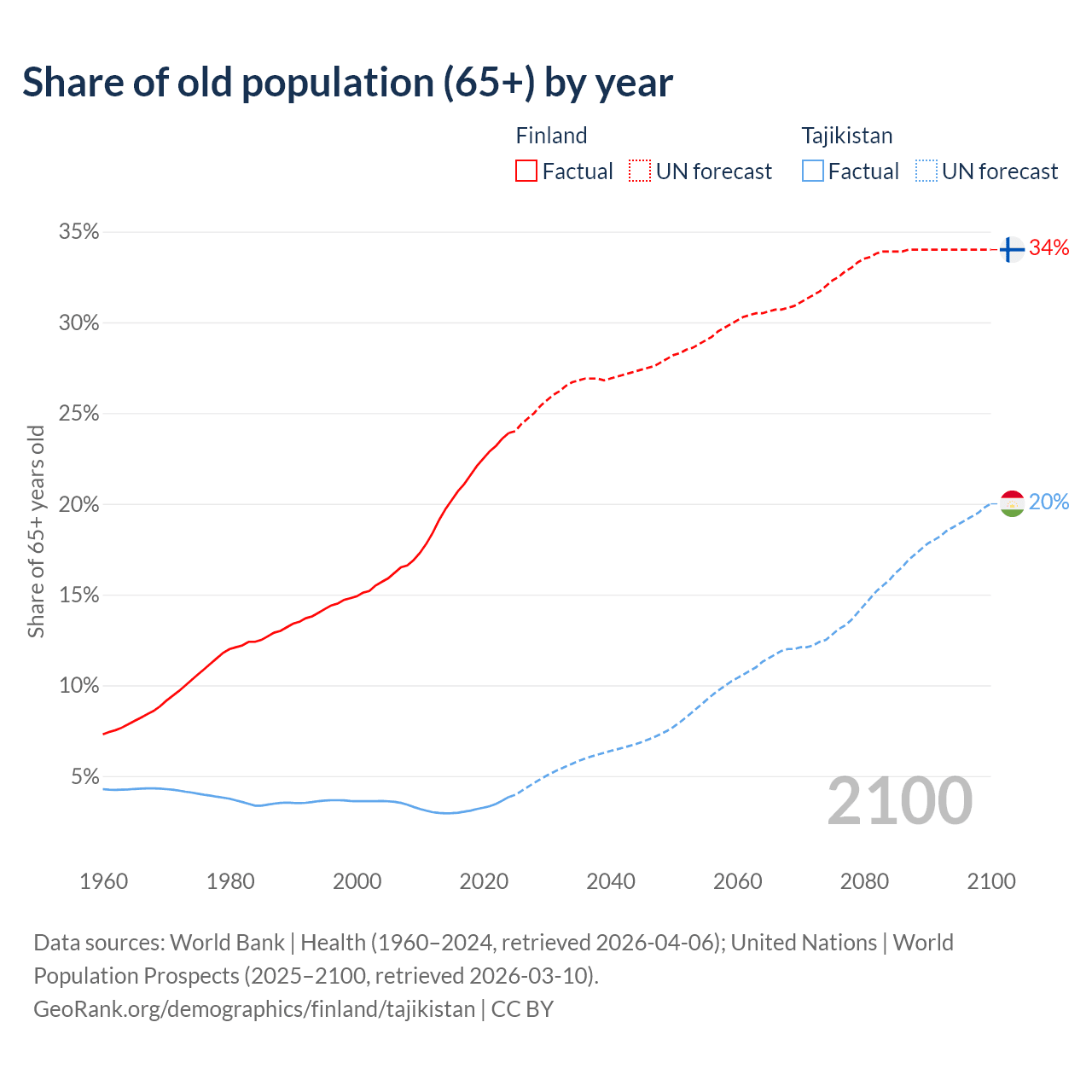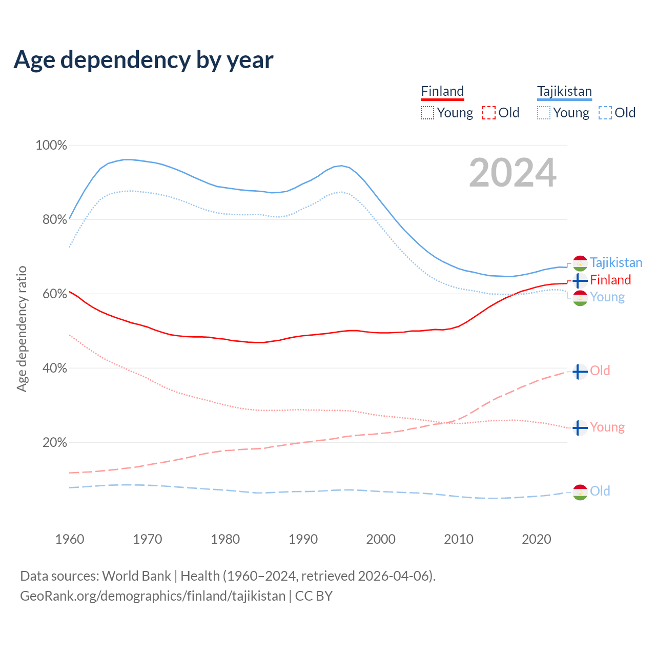 - The share of old-age demographic (65+) in Finland is 23.9% vs 3.85% in Tajikistan.