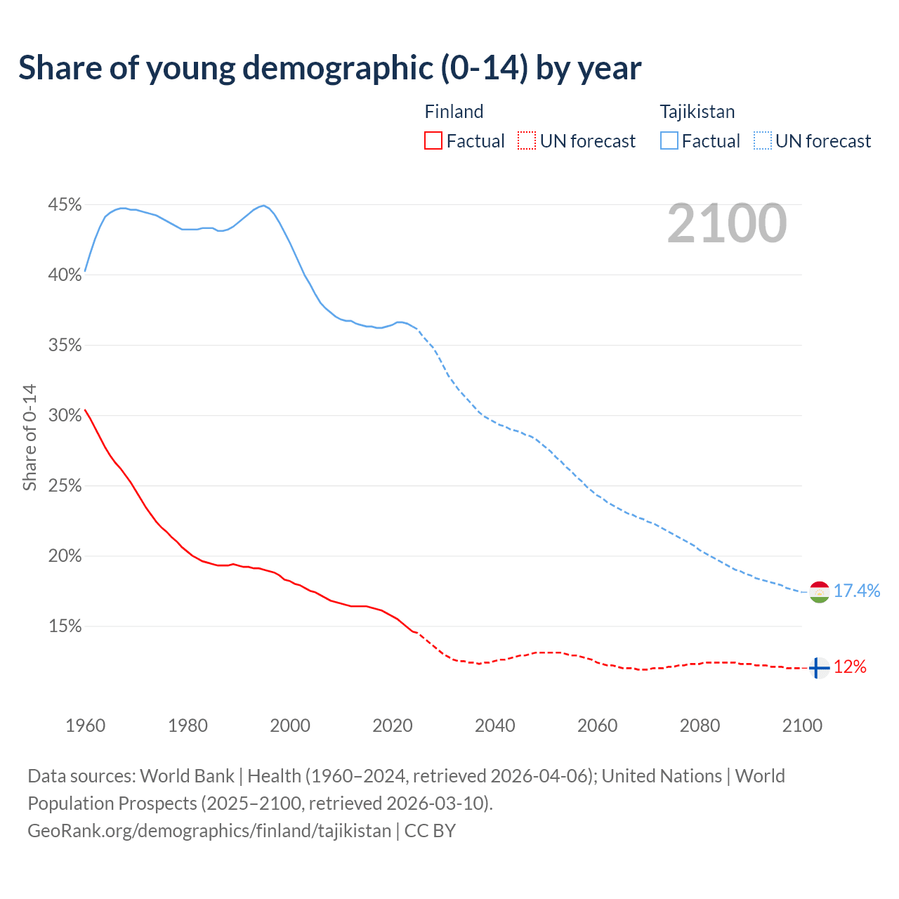 - The share of young demographic (0-15 years old) in Finland is 14.6% vs 36.3% in Tajikistan.