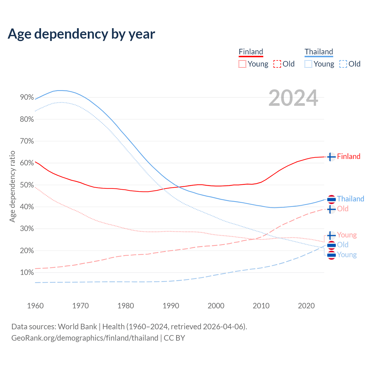 - Finland is ranked 22/196 by median age (oldest to youngest) vs 40/196 for Thailand.