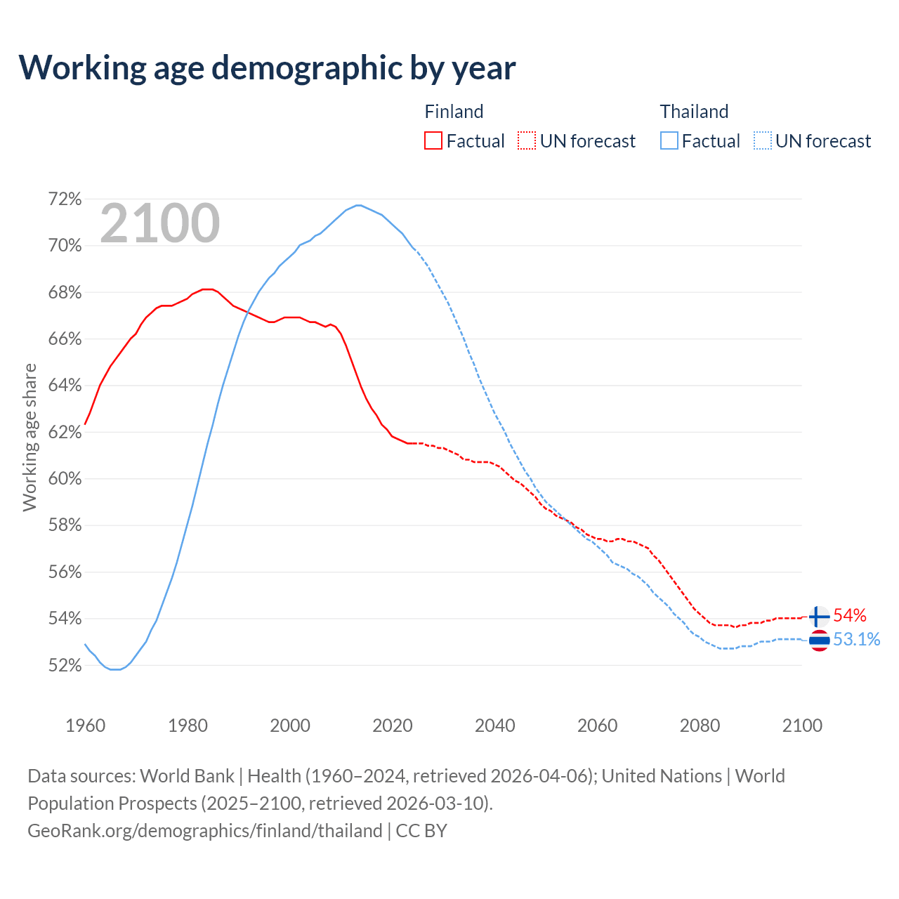Median age Finland vs Thailand, 1960-2100