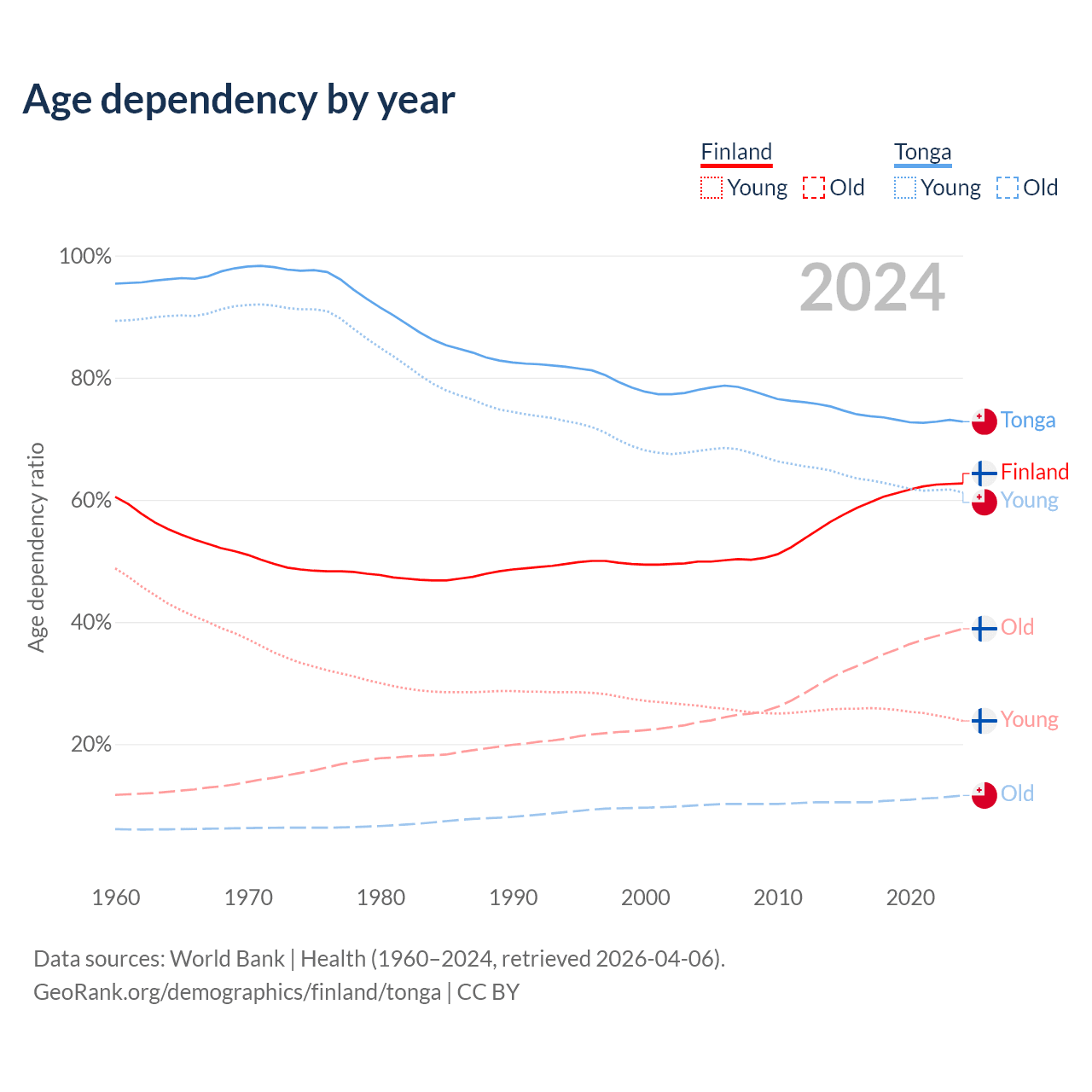 - The share of old-age demographic (65+) in Finland is 23.9% vs 6.72% in Tonga.