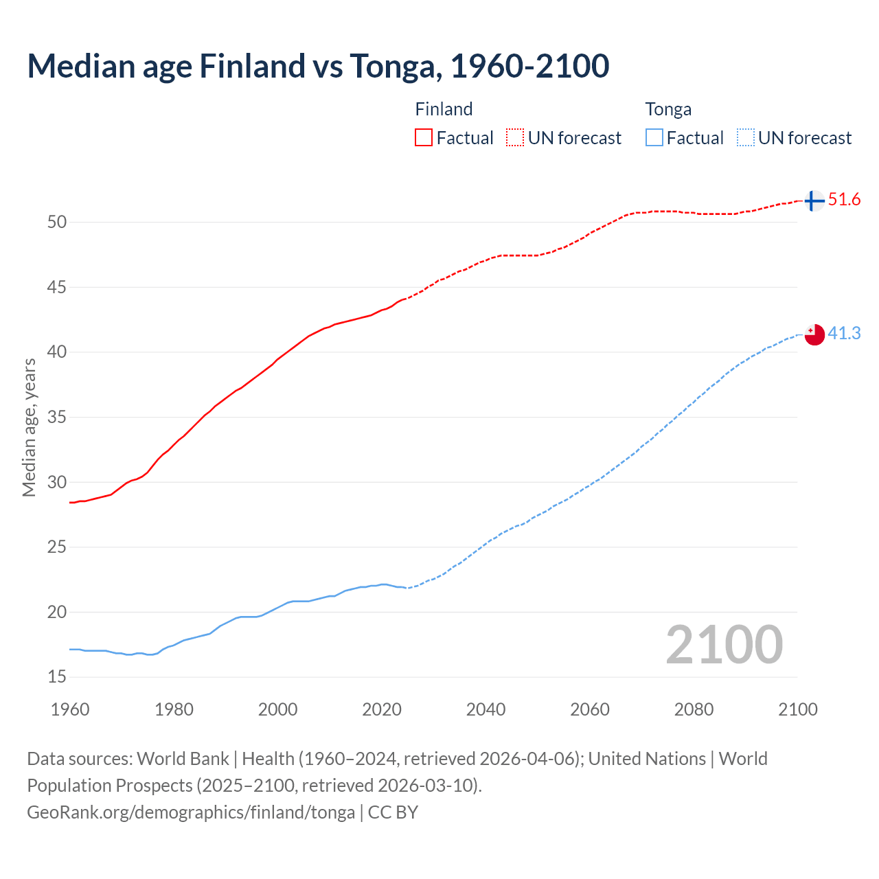 Median age Finland vs Tonga, 1960-2100