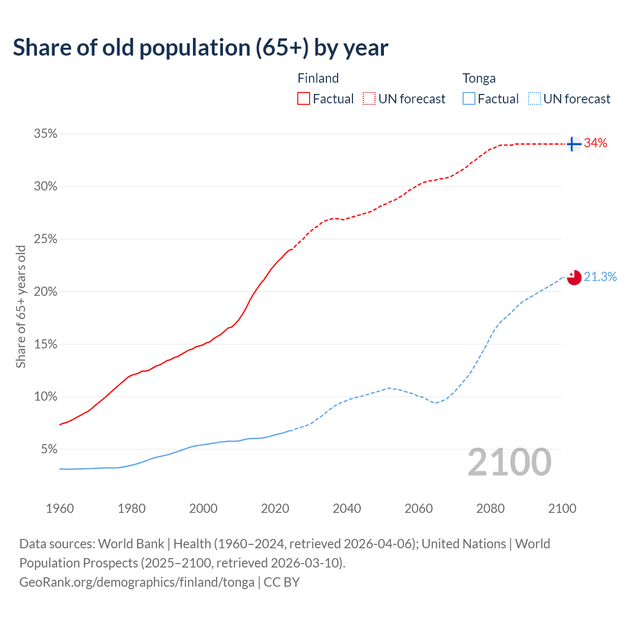 The share of older people aged 65 and over is 23.9% in Finland and 6.72% in Tonga. Life expectancy in Finland compared to Tonga .