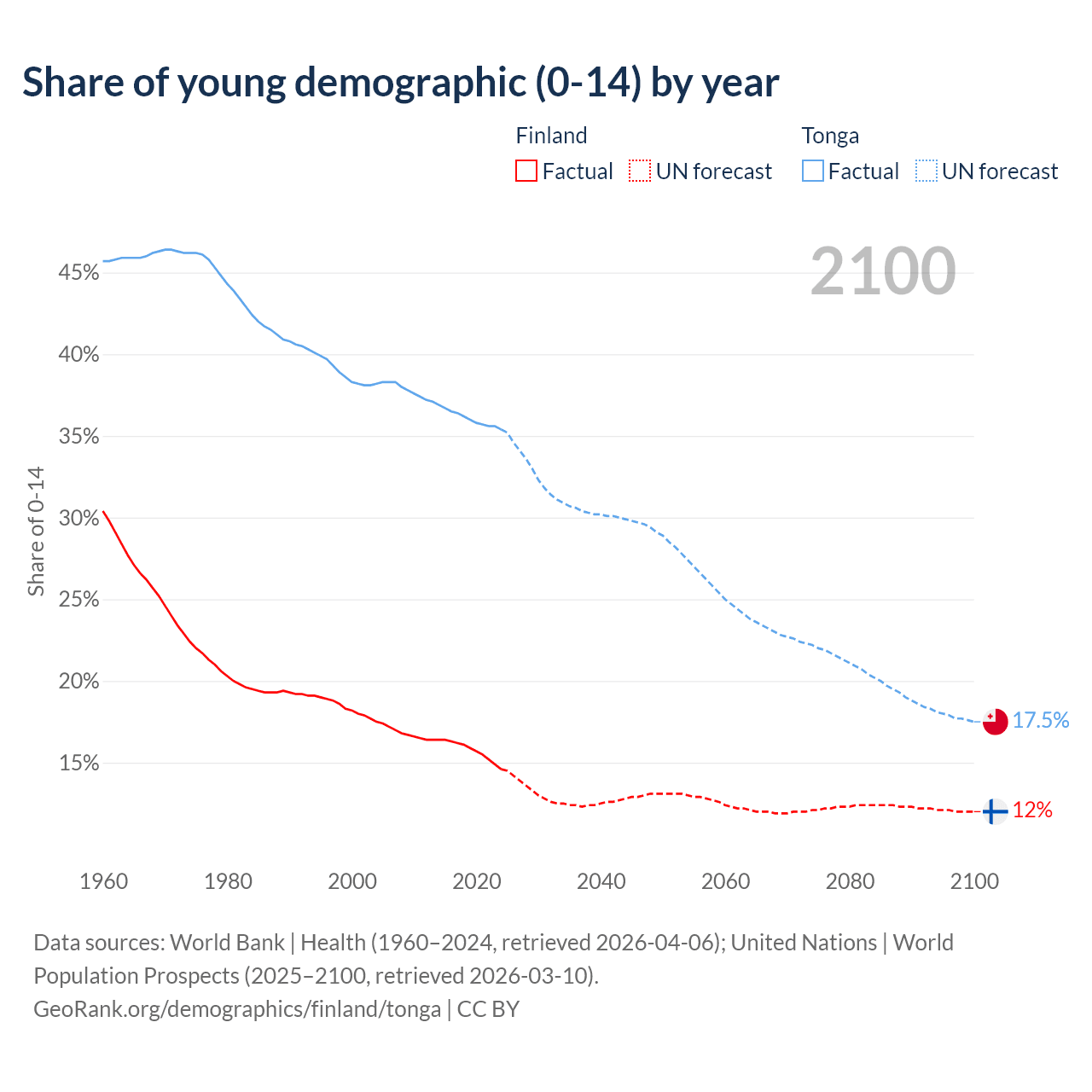 - The share of young demographic (0-15 years old) in Finland is 14.6% vs 35.4% in Tonga.