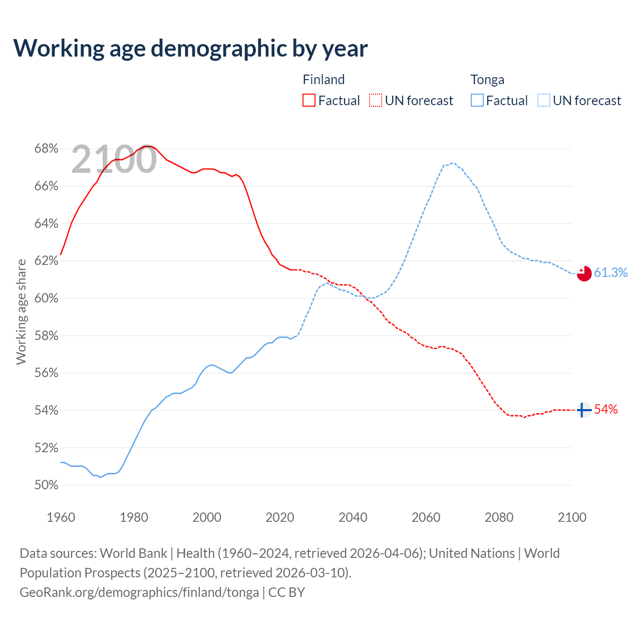 - Finland has 3.46M working age adults (aged 15-64) vs 59.8K in Tonga.