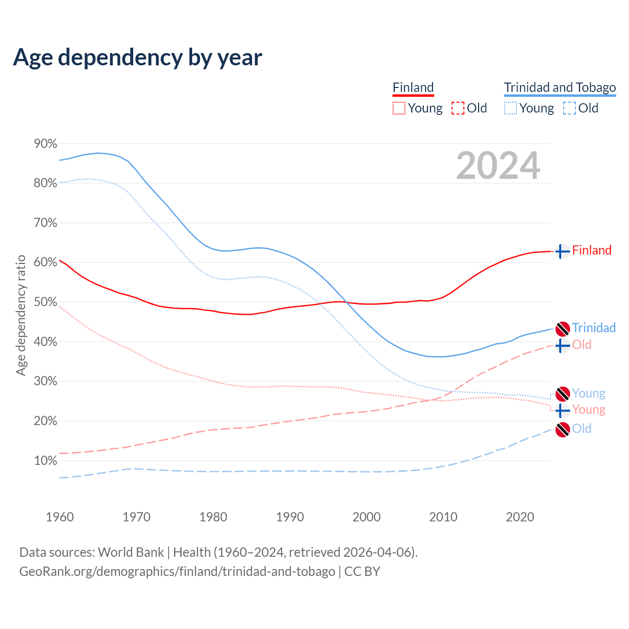 - The share of old-age demographic (65+) in Finland is 23.9% vs 12.4% in Trinidad and Tobago.