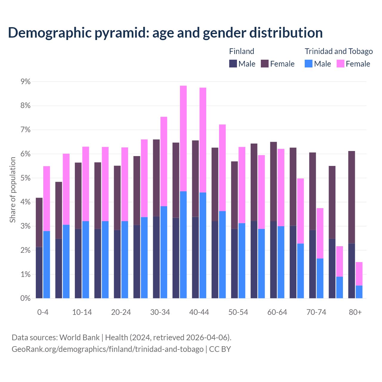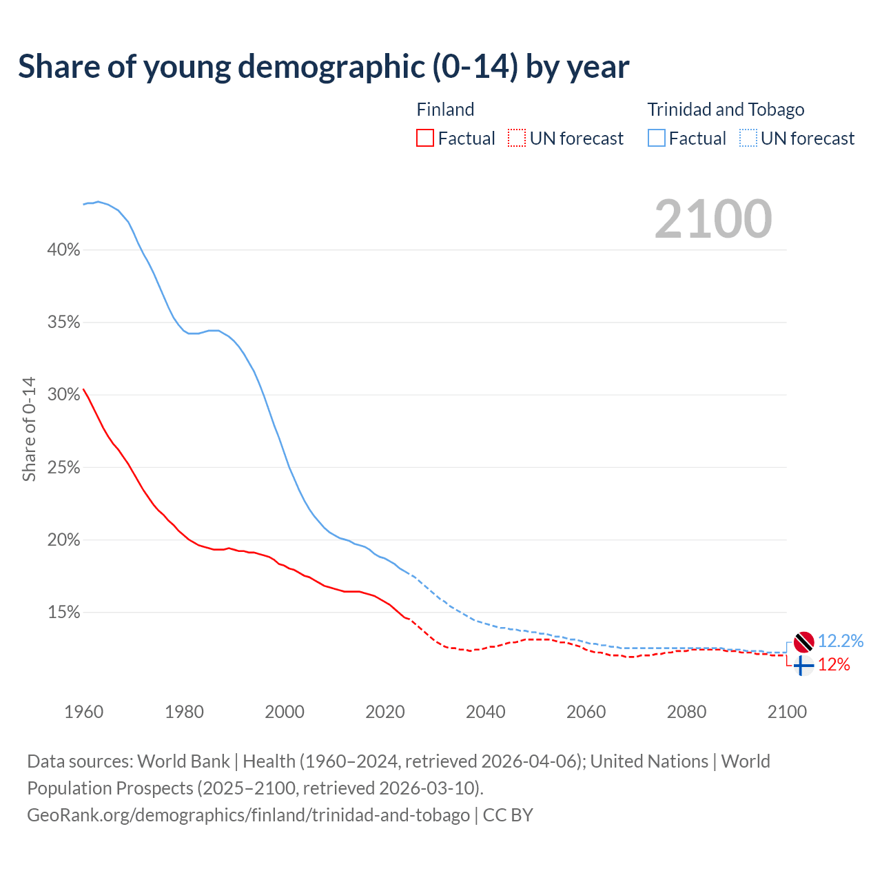 - The share of young demographic (0-15 years old) in Finland is 14.6% vs 17.8% in Trinidad and Tobago.