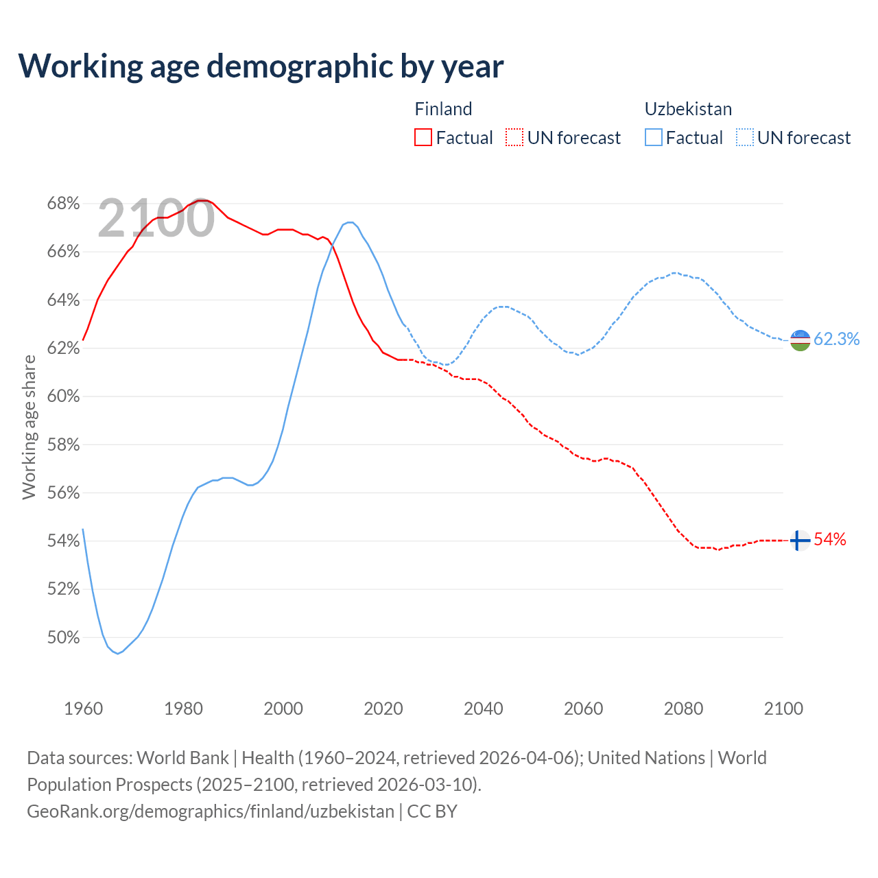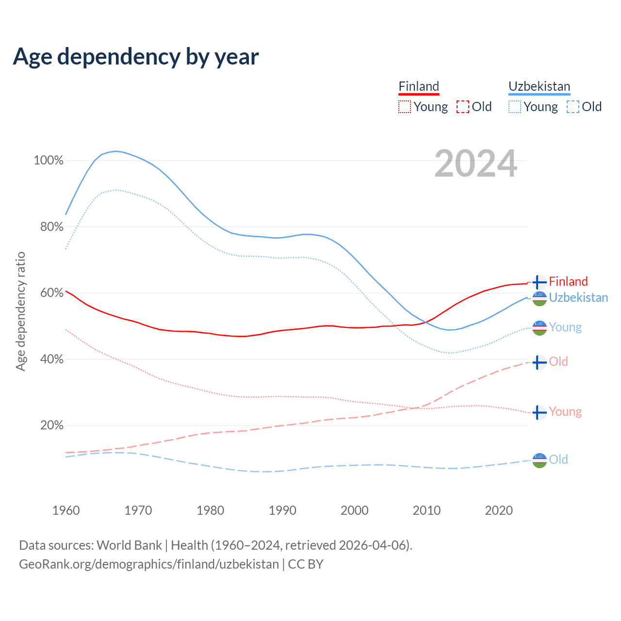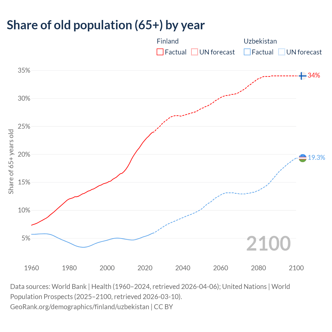 - The share of old-age demographic (65+) in Finland is 23.9% vs 5.86% in Uzbekistan.