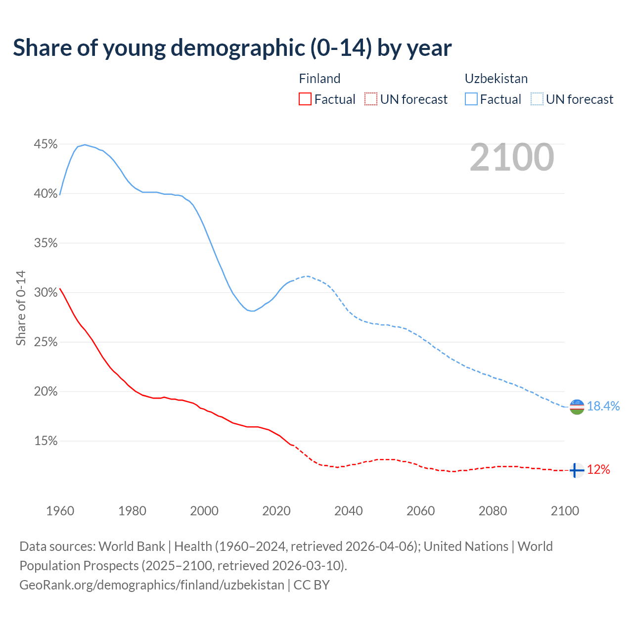 - The share of young demographic (0-15 years old) in Finland is 14.6% vs 31.1% in Uzbekistan.