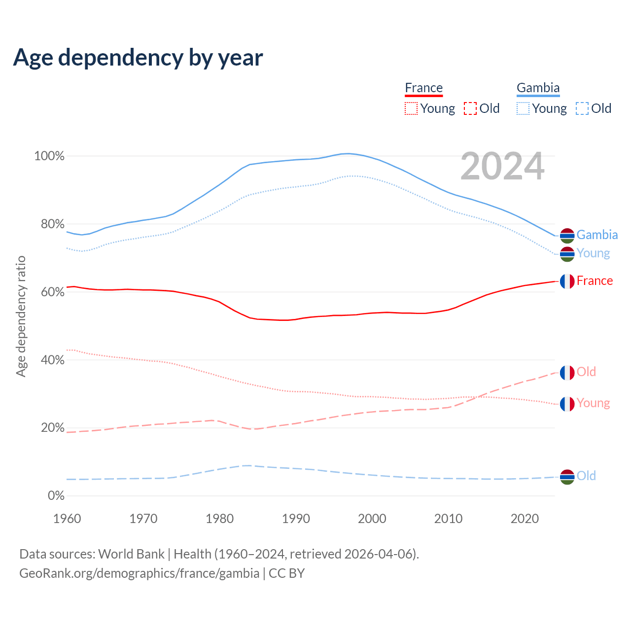 - France is ranked 29/196 by median age (oldest to youngest) vs 171/196 for the Gambia.