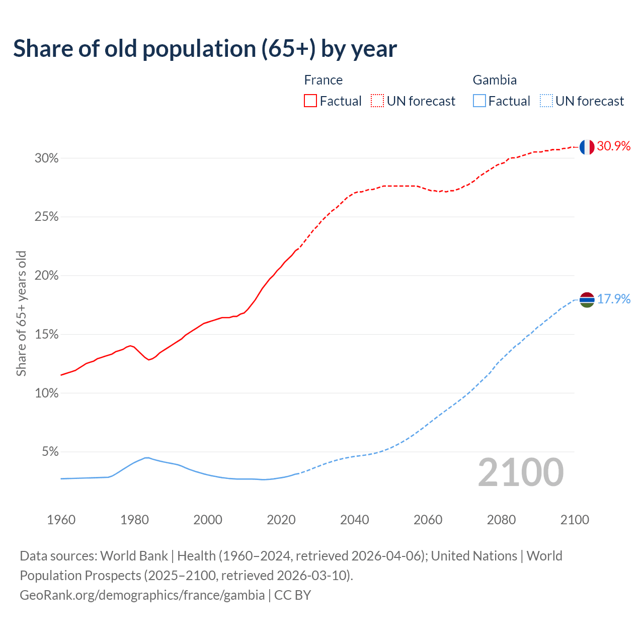 The share of older people aged 65 and over is 22.1% in France and 3.08% in the Gambia. Life expectancy in France compared to the Gambia .