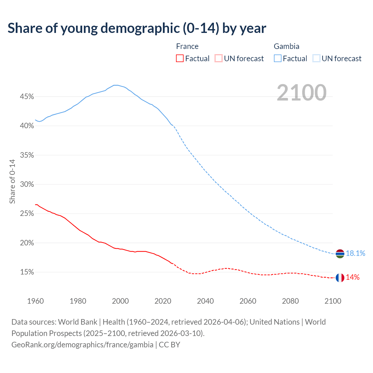 - The share of young demographic (0-15 years old) in France is 16.5% vs 40.2% in the Gambia.