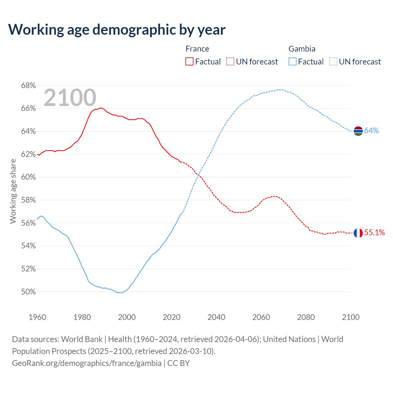- France has 42.2M working age adults (aged 15-64) vs 1.64M in the Gambia.