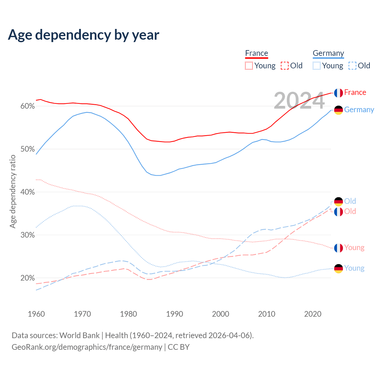 - France is ranked 29/196 by median age (oldest to youngest) vs 9/196 for Germany.