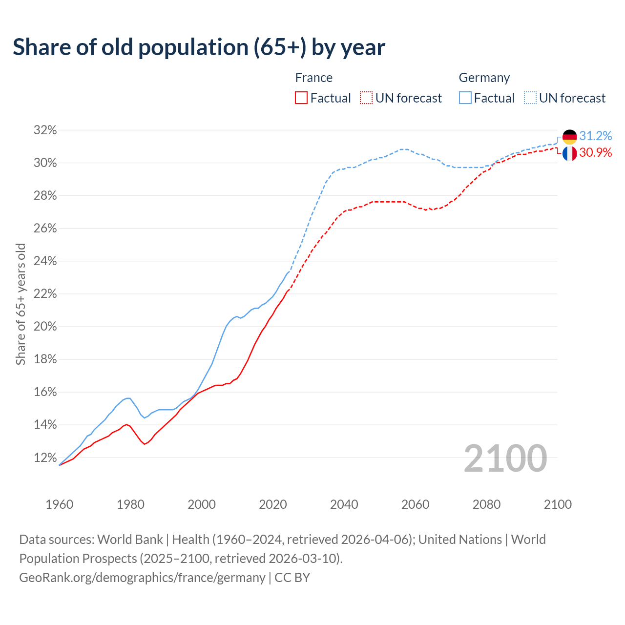 The share of older people aged 65 and over is 22.1% in France and 23.2% in Germany. Life expectancy in France compared to Germany .