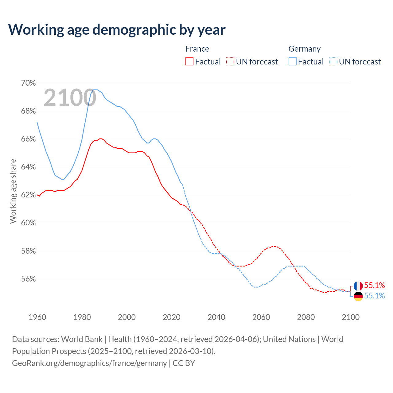 Median age France vs Germany, 1960-2100
