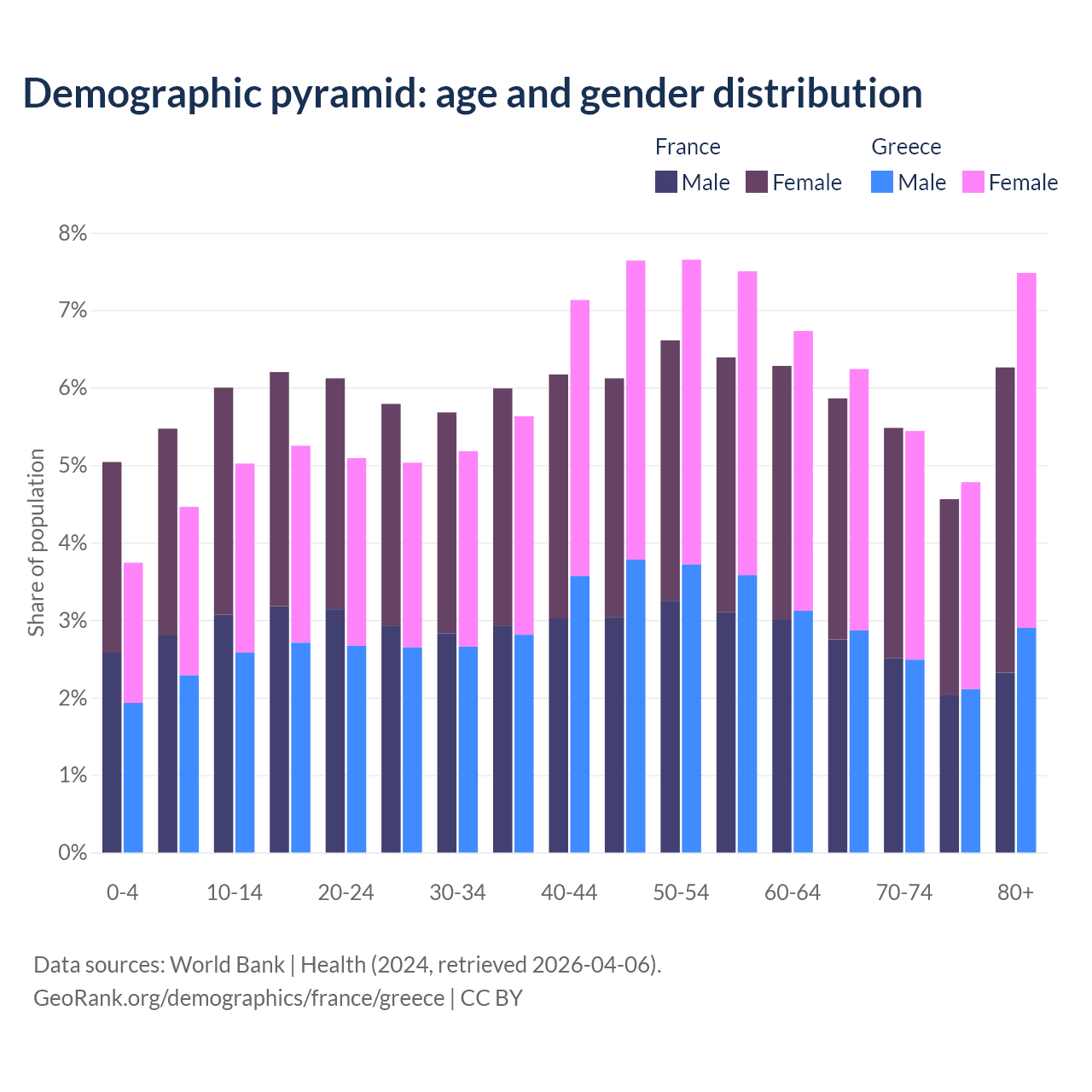 - France is ranked 29/196 by median age (oldest to youngest) vs 6/196 for Greece.