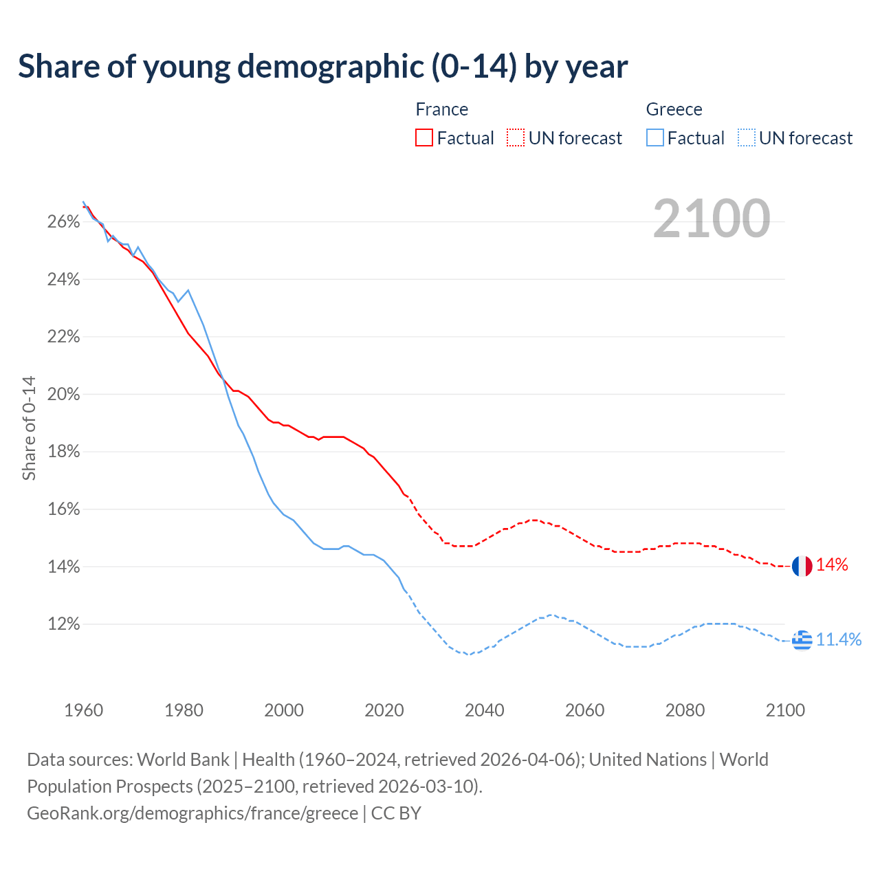 - The share of young demographic (0-15 years old) in France is 16.5% vs 13.2% in Greece.