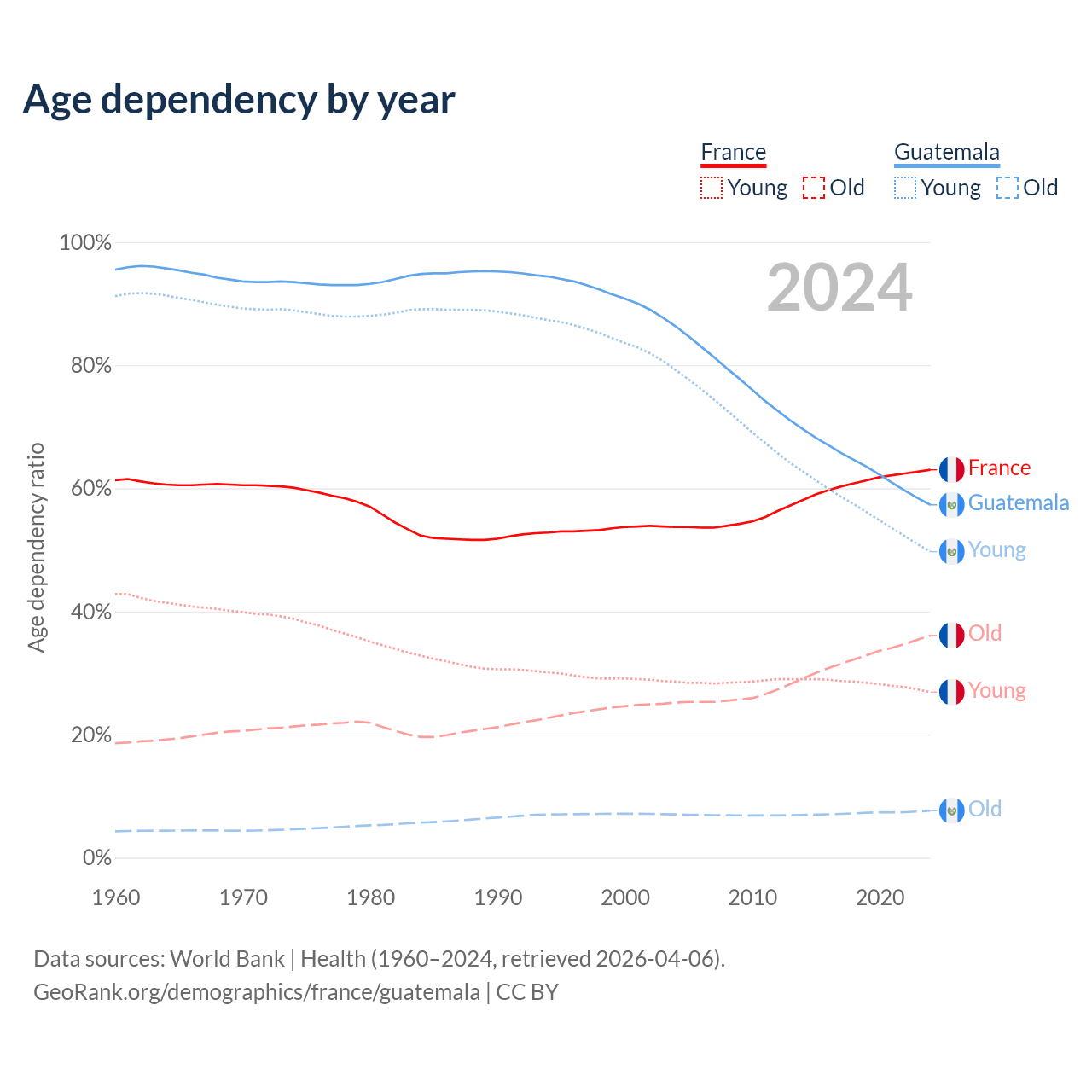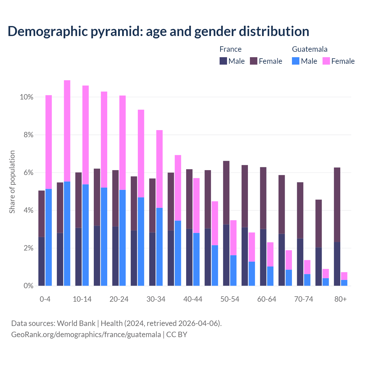 - France is ranked 29/196 by median age (oldest to youngest) vs 137/196 for Guatemala.