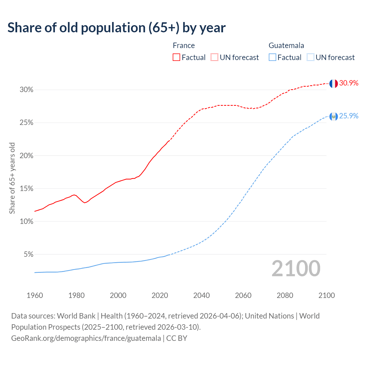 - The share of old-age demographic (65+) in France is 22.1% vs 4.85% in Guatemala.