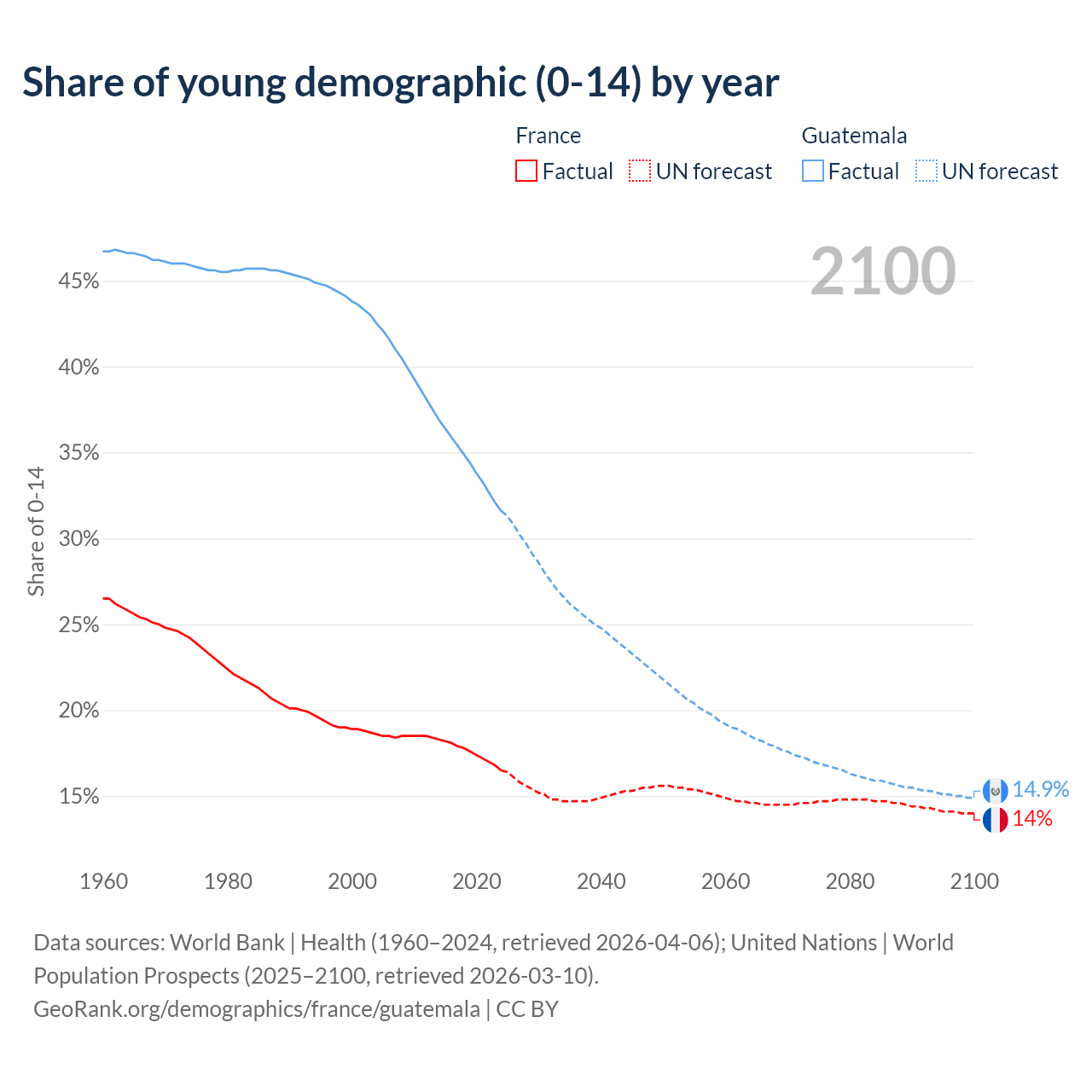 - The share of young demographic (0-15 years old) in France is 16.5% vs 31.6% in Guatemala.