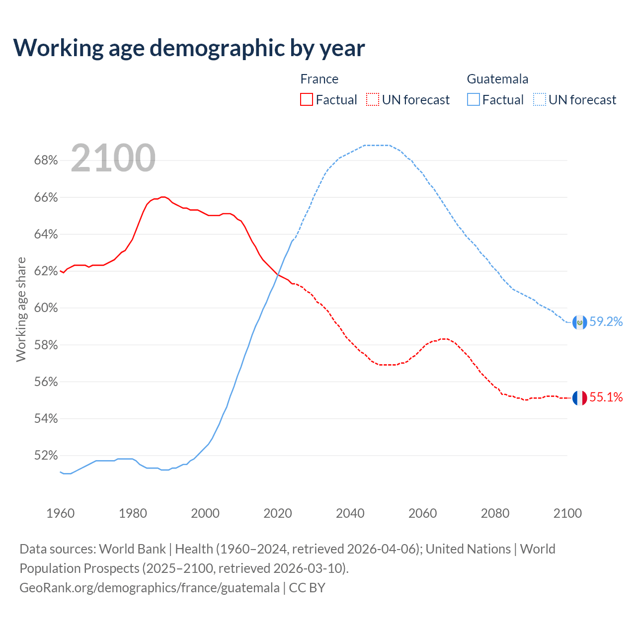 - France has 42.2M working age adults (aged 15-64) vs 12.1M in Guatemala.