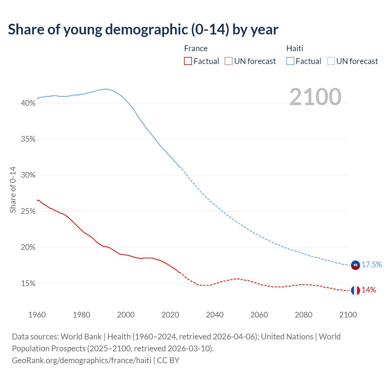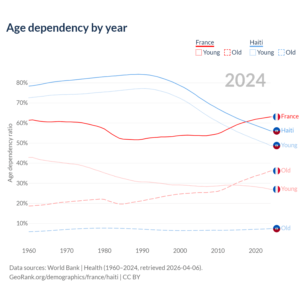 - France is ranked 29/196 by median age (oldest to youngest) vs 135/196 for Haiti.