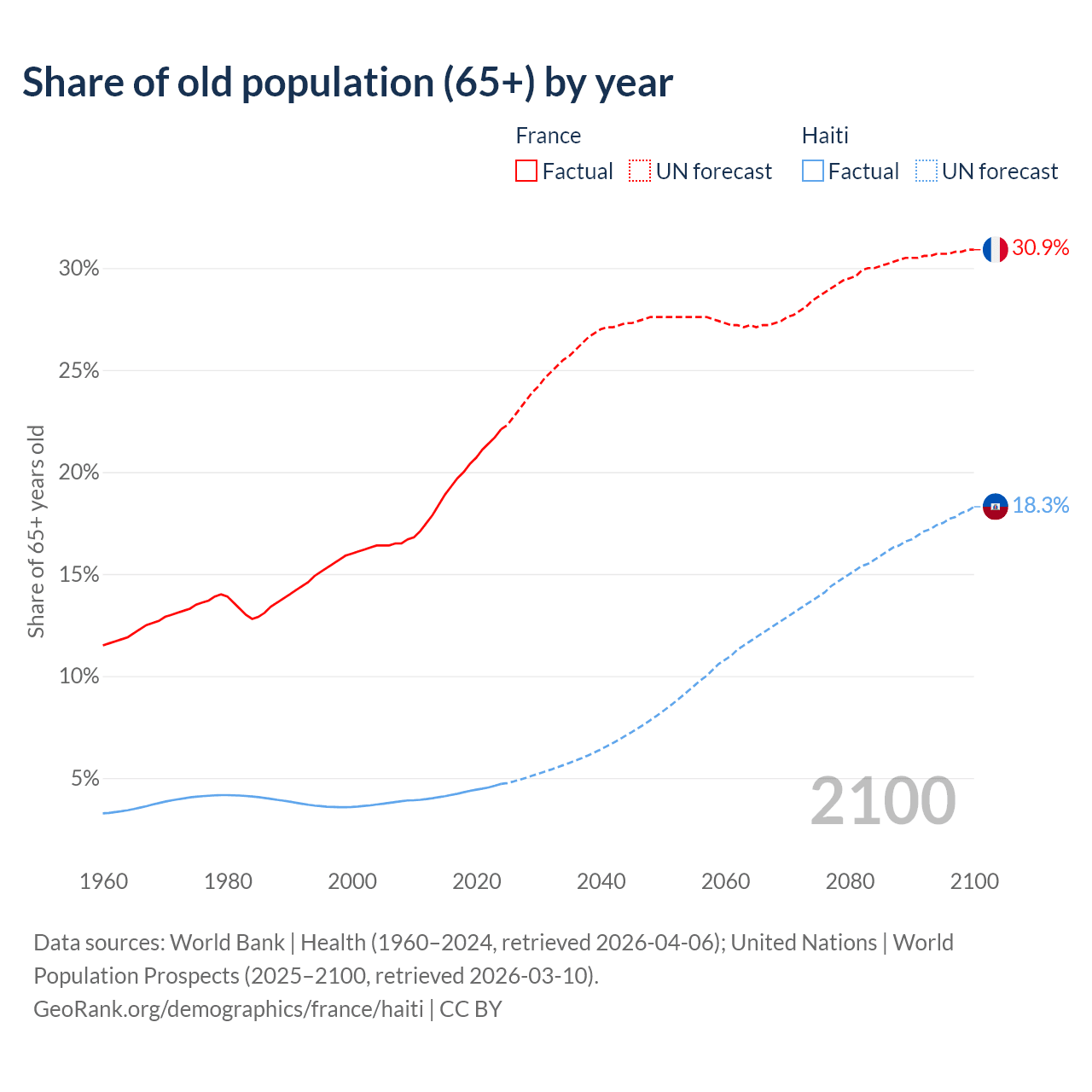 - The share of old-age demographic (65+) in France is 22.1% vs 4.71% in Haiti.