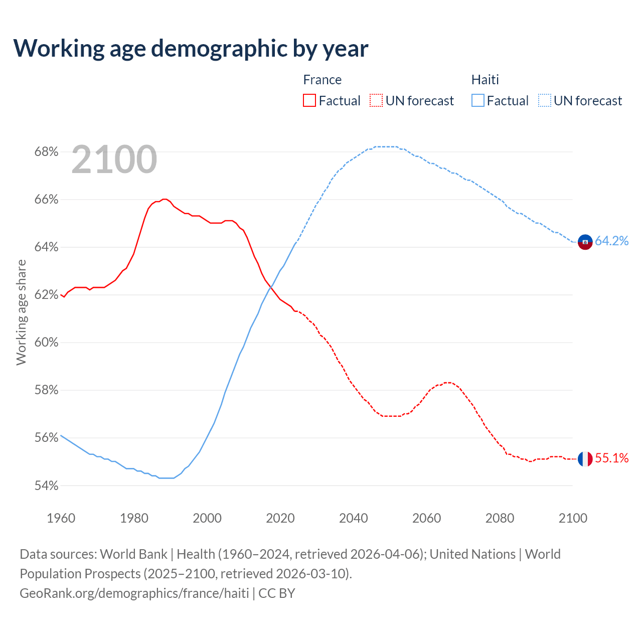 - France has 42.2M working age adults (aged 15-64) vs 7.74M in Haiti.