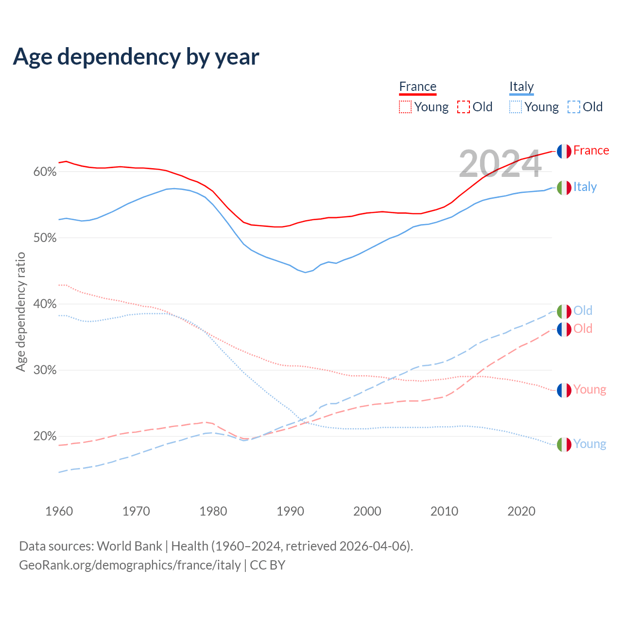 - France is ranked 29/196 by median age (oldest to youngest) vs 4/196 for Italy.