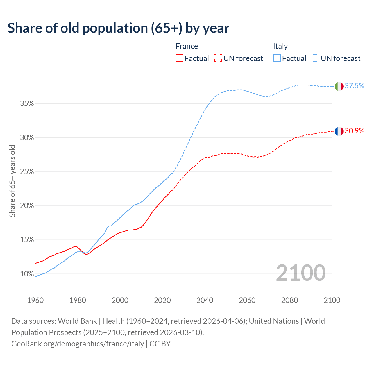 The share of older people aged 65 and over is 22.1% in France and 24.6% in Italy. Life expectancy in France compared to Italy .